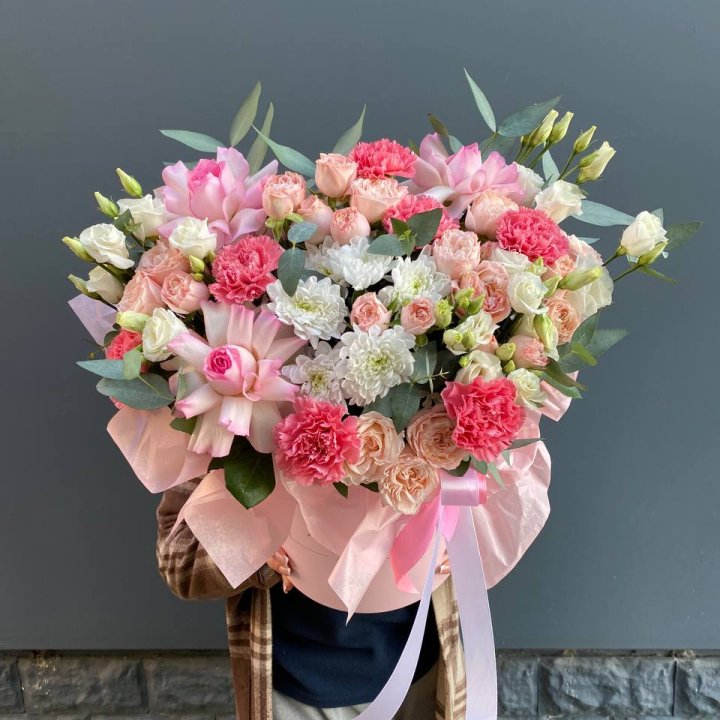 Ассортимент рабочий, под разные поводы. Розы Red Naomi и Freedom от 50 до 70 см стебель, кустовые хризантемы, альстромерия, гипсофила, эустома, эвкалипт. В сезон — пионы (конец мая — июнь), ранункулюсы зимой и ранней весной, тюльпаны весной. Авторские миксы с эвкалиптом и лавандой — для тех, кому нужна небанальная композиция.