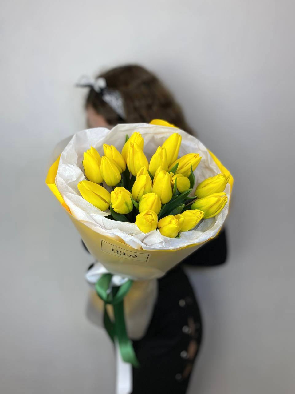 Бутоны держат форму долго и радуют свежестью. Девятнадцать жёлтых тюльпанов в лаконичной упаковке удобны для размещения в любом интерьере.