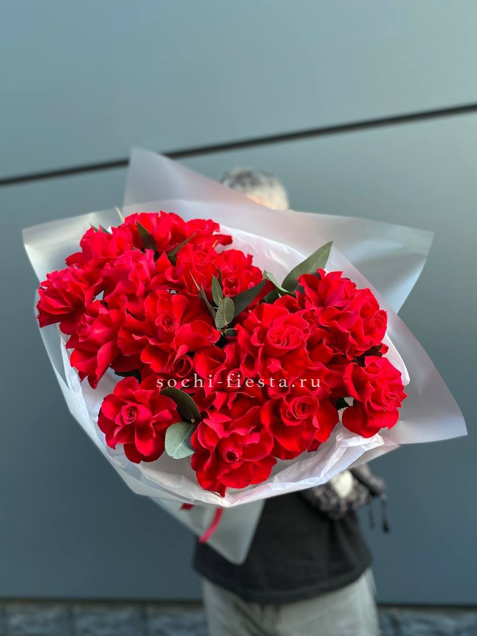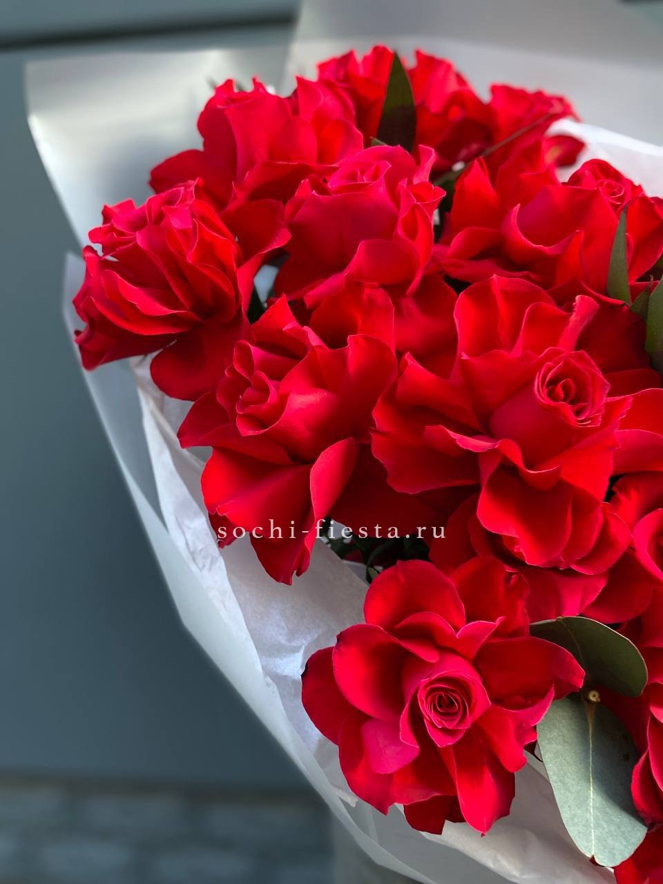 Двадцать семь роз выложены в форме сердца и сохраняют этот силуэт благодаря продуманной сборке. Композиция читается как цельный графичный знак, где каждый бутон занимает своё место в общем рисунке.