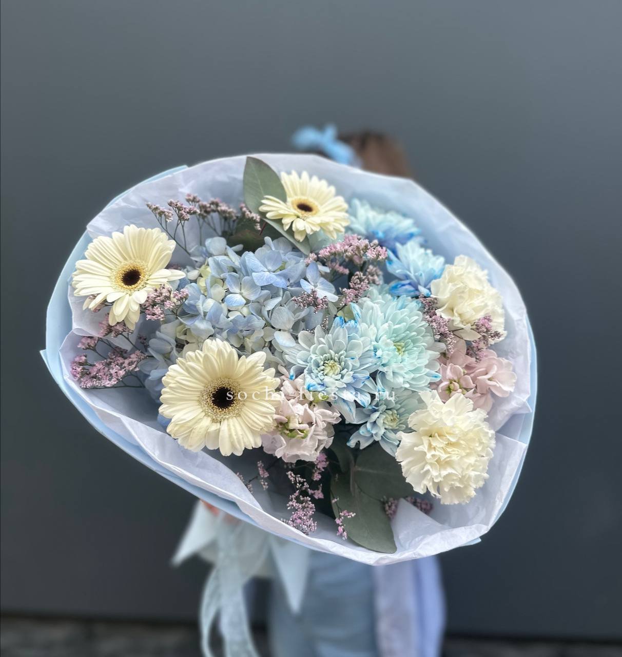Пять соцветий необычного голубого оттенка образуют воздушную композицию. Гортензии притягивают взгляд своей редкой палитрой и мягкой фактурой. Монобукет для ценителей нестандартных решений.