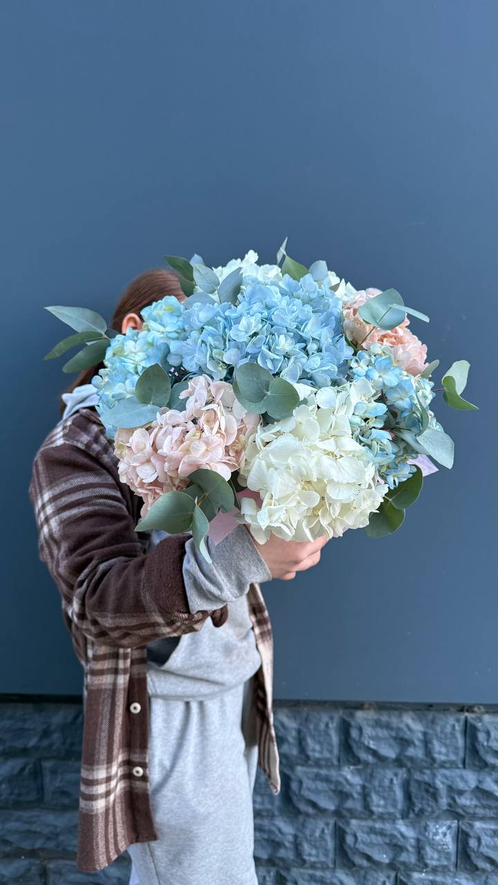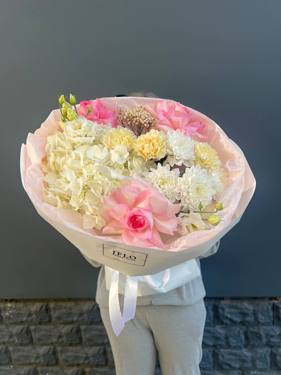 Гортензия и пионовидные розы создают густую округлую форму с мягкими переходами оттенков. Диантус добавляет воздушные вкрапления между крупными бутонами. Композиция в сумке-кашпо держит силуэт и выглядит цельно.