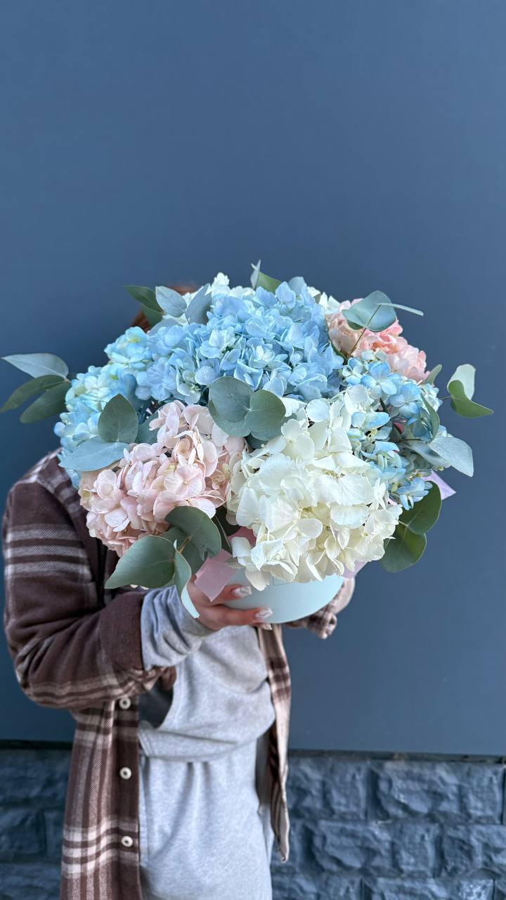 гортензия, розовые розы, пионовидные розы, диантус, эвкалипт, лента, сумка-кашпо.