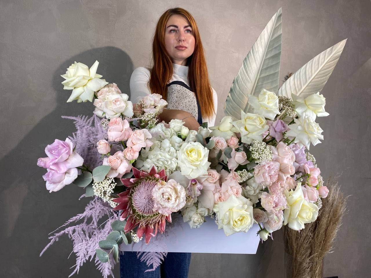 Крупные головки протеи задают ритм всей композиции, а пионовидные розы и гортензия создают плотную текстурную волну. Орхидеи и эустома добавляют воздушности, листья стрелиции направляют взгляд вверх, формируя динамичный силуэт в деревянном боксе.
