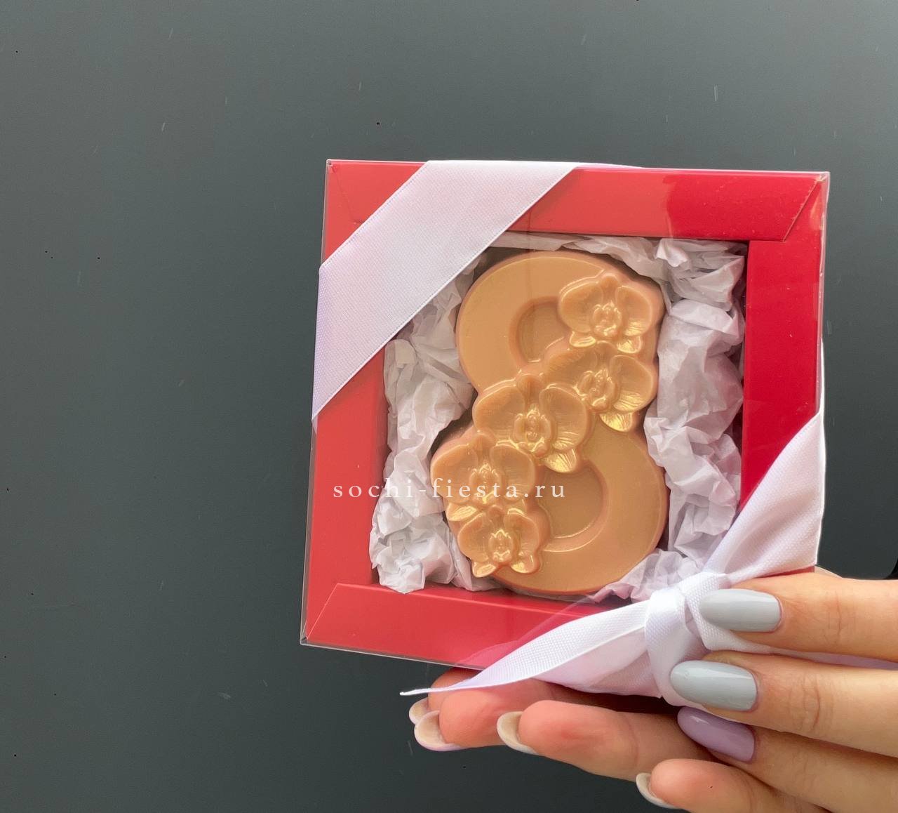цифра 8 из бельгийского шоколада (белый шоколад: сахар, масло какао, сухое цельное молоко, соевый лецитин, натуральный амортизатор Ваниль). Ручная роспись.