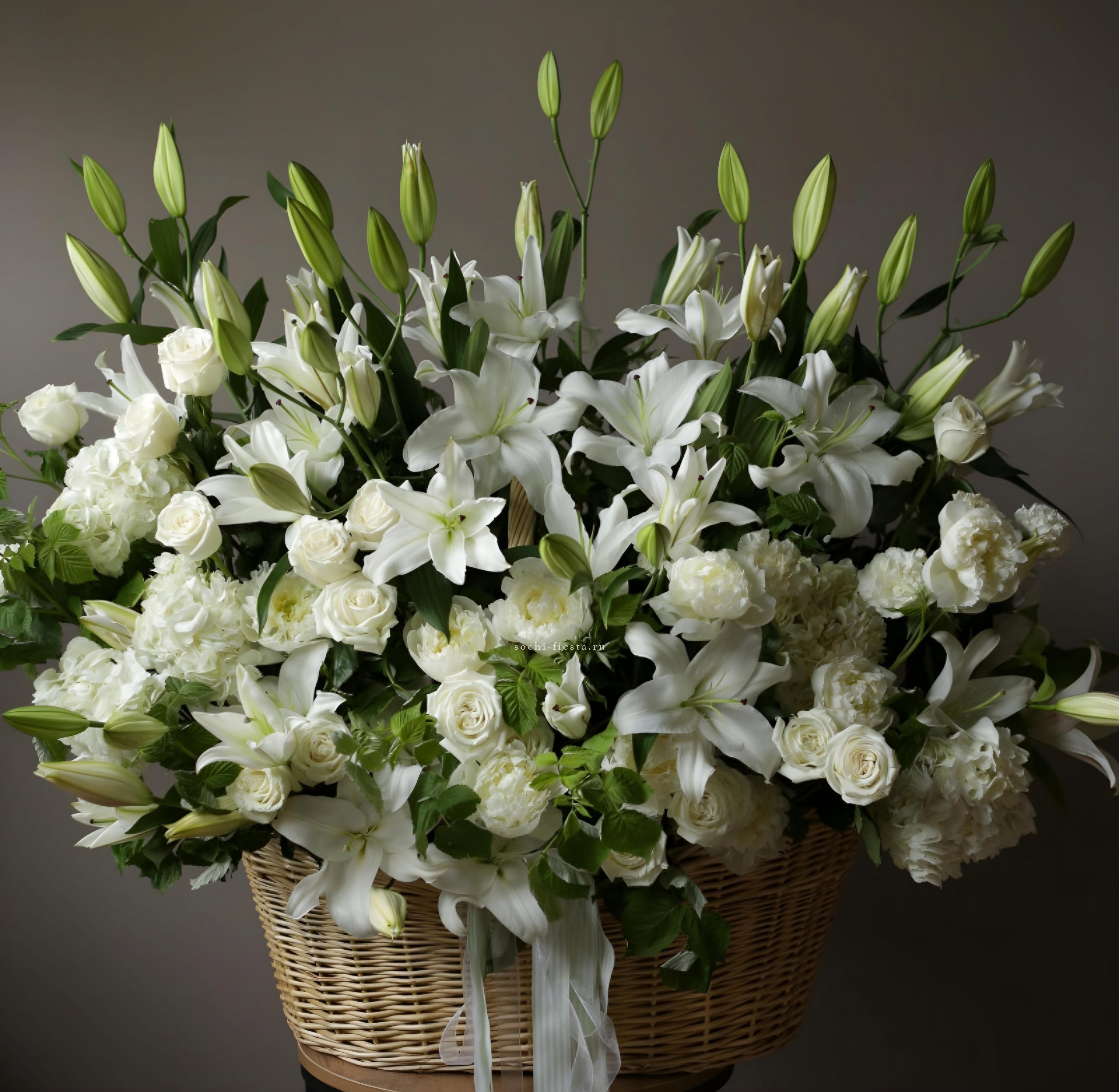 Белоснежные диантусы с пышными лепестками держат форму и долго сохраняют свежесть. Серебристый эвкалипт разбавляет плотность бутонов и добавляет прохладные нотки в композицию.
