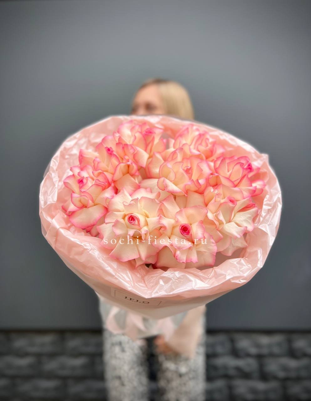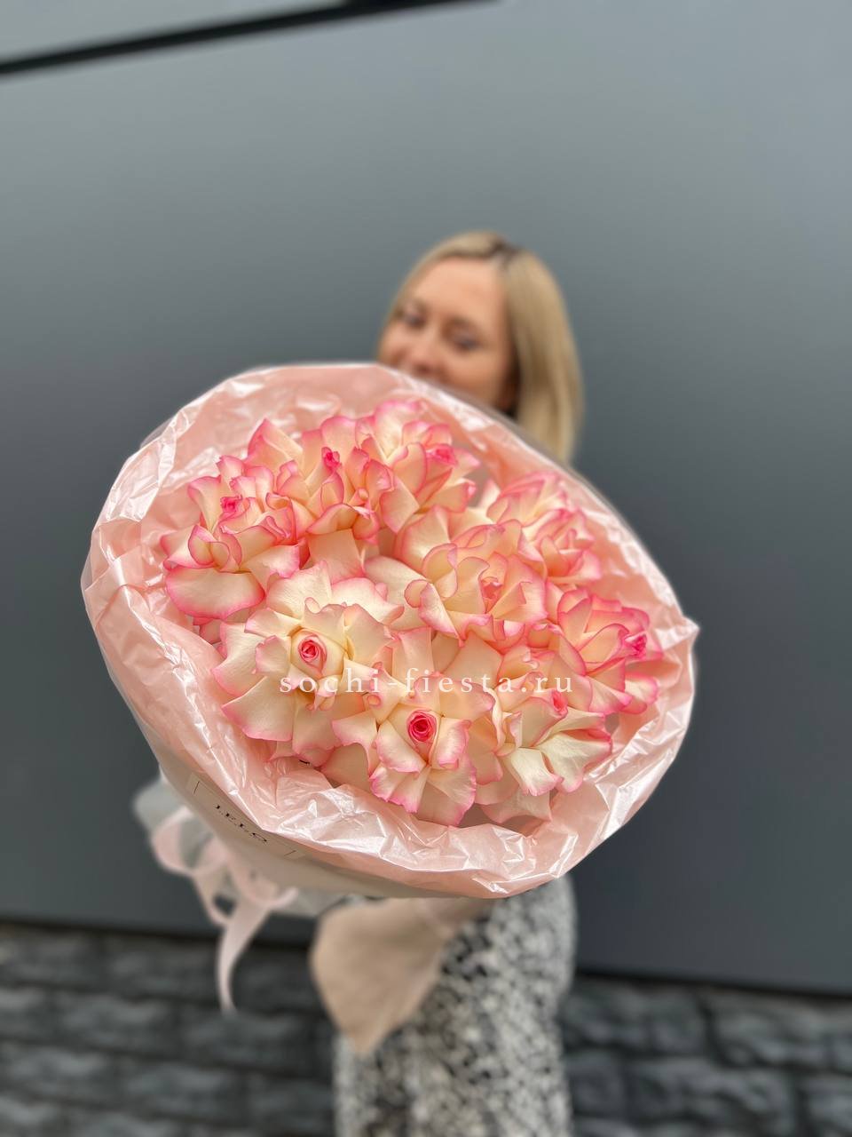 Пятьдесят пять бутонов создают объемную композицию с выразительным силуэтом. Розовый цвет наполняет пространство светом. Авторское оформление завершает образ.