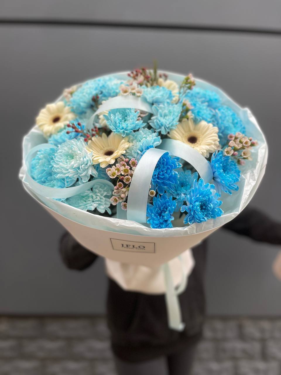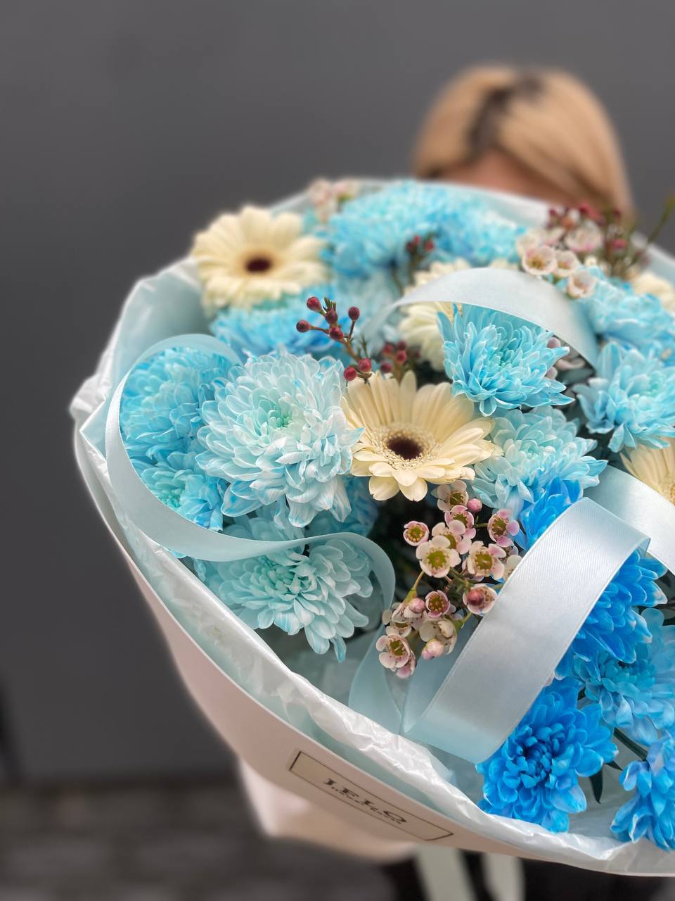 Этот невероятный букет — настоящее лазурное облако, которое переносит в атмосферу свежести и безмятежности. Композиция представляет собой стильный микс из голубых и нежно-бирюзовых кустовых хризантем, дополненных акцентными белыми герберами и мелкими соцветиями хамелациума.