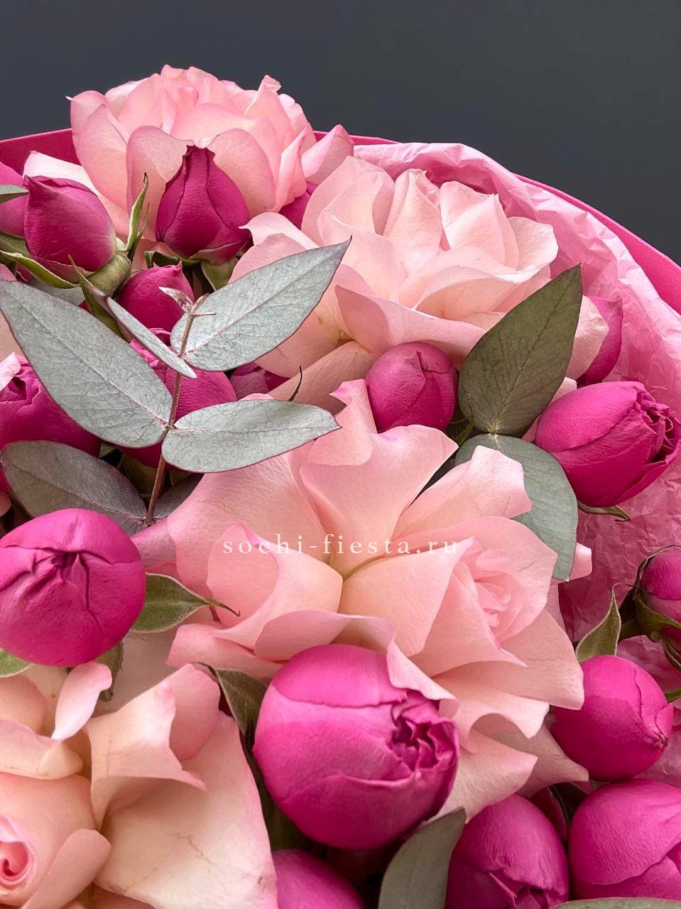 кустовые розы, эустома, хлопок, лента и дизайнерская пленка.
