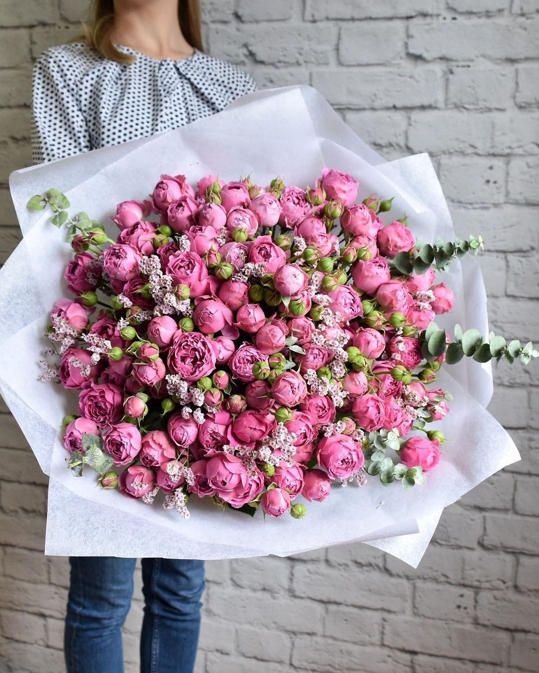 диантусы, эустома, розовые розы, лимониум(или аналог), озатамус, эвкалипт, упаковка.