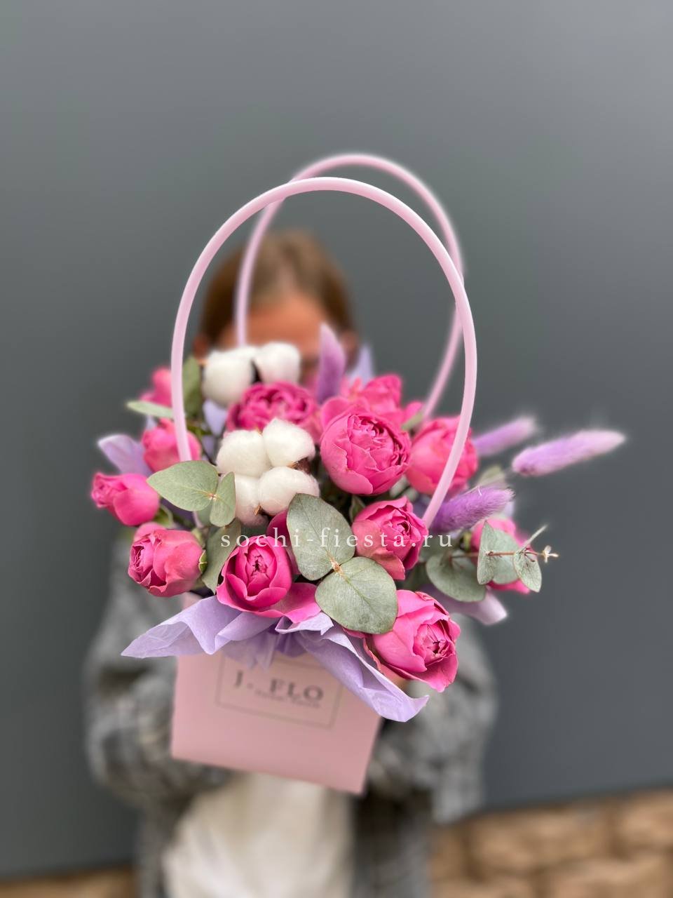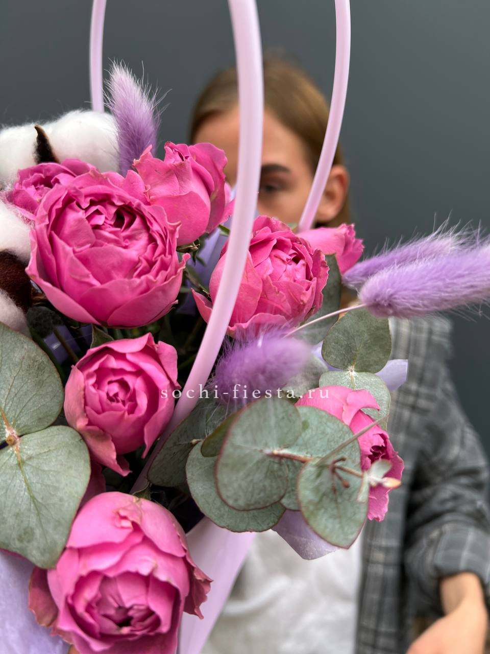 Пионовидные розы раскрываются густыми лепестками, хамелациум добавляет воздушности. Композиция держит форму и долго сохраняет свежесть.