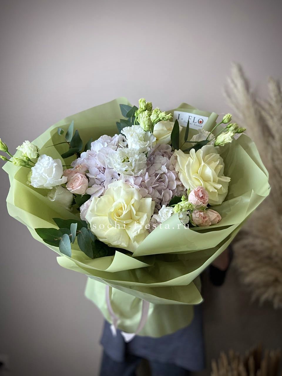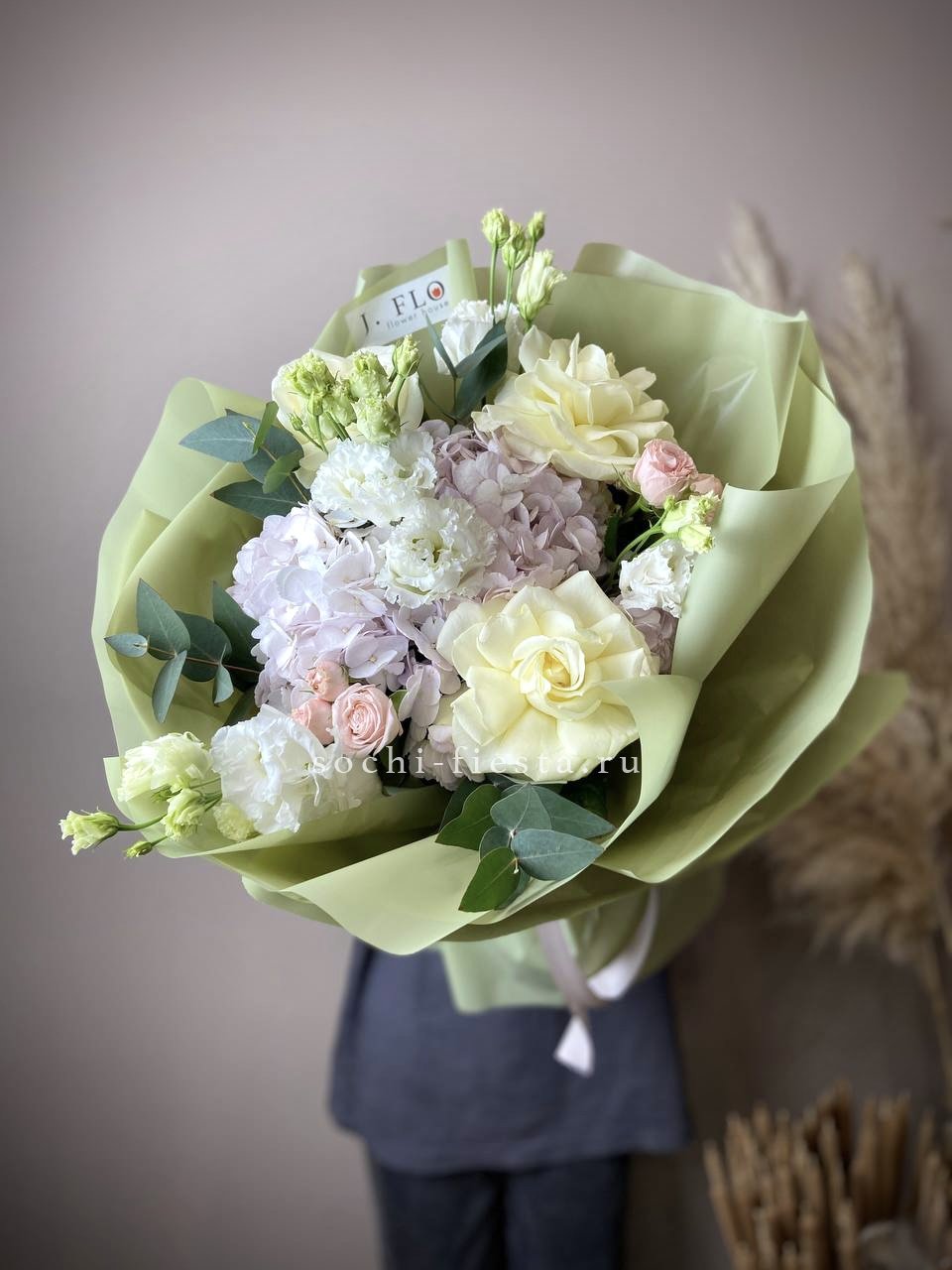 гортензия, озотамнус (или аналог сезона), мисти бабблс, диантус, авторское оформление.