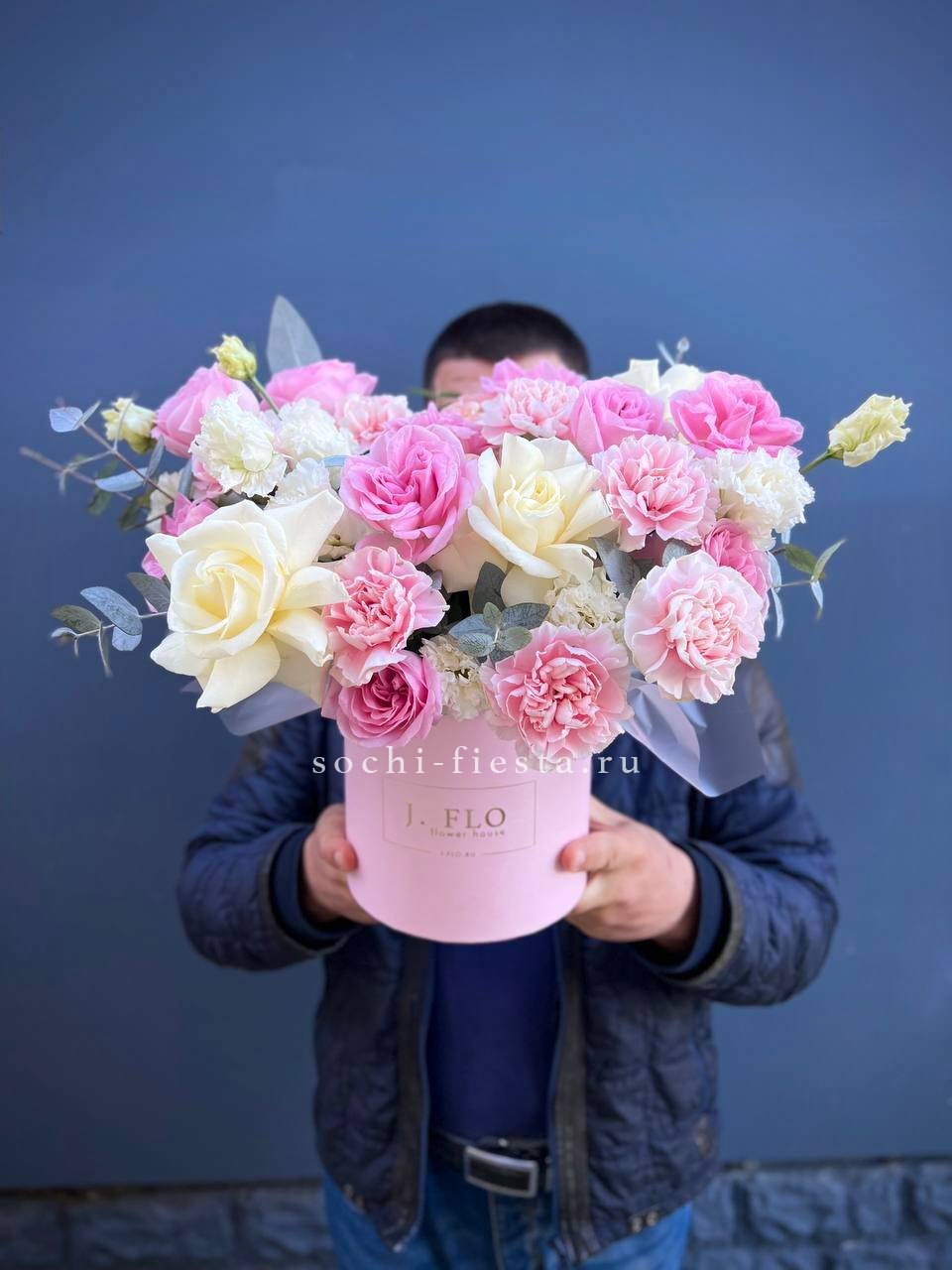 Белые и розовые розы переплетаются с эустомой и диантусом в круглом цилиндре. Эвкалипт добавляет объём и свежесть композиции. Сочная палитра для яркого поздравления.