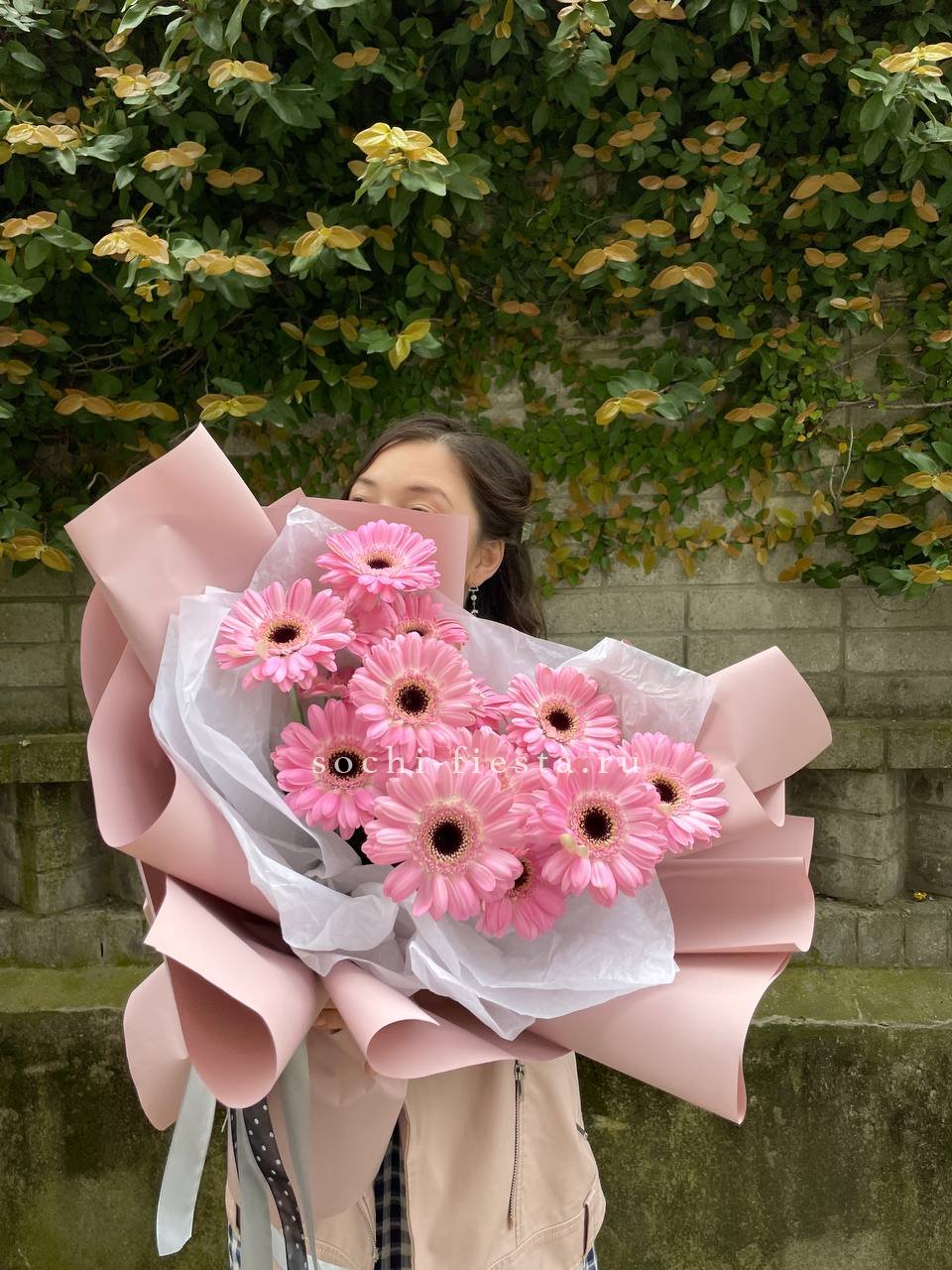 Розовые герберы отличаются похожими на маргаритки или подсолнухи соцветиями с длинными, бархатистыми лепестками, которые расходятся от центральной сердцевины. Оттенок может варьироваться от очень нежного, бледного розового до насыщенного ярко-розового цвета. Цветы обычно располагаются на длинных прочных стеблях без листьев.