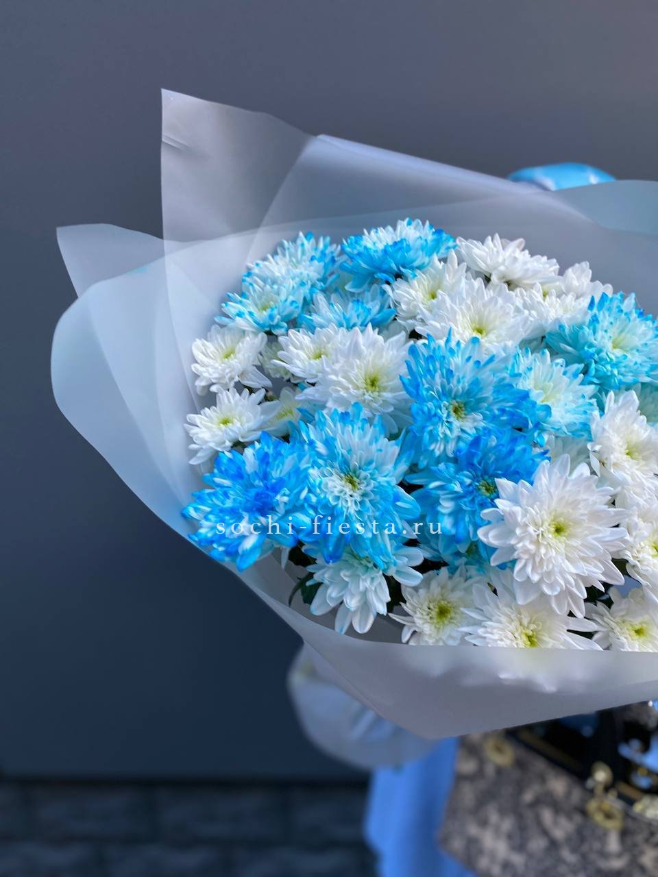 Семь пышных соцветий хризантемы с игривыми завитыми лепестками собраны в плотную композицию. Золотистый эвкалипт добавляет теплое мерцание и завершает образ. Яркий жест для тех, кто любит выразительные формы и живую энергию цветов.
