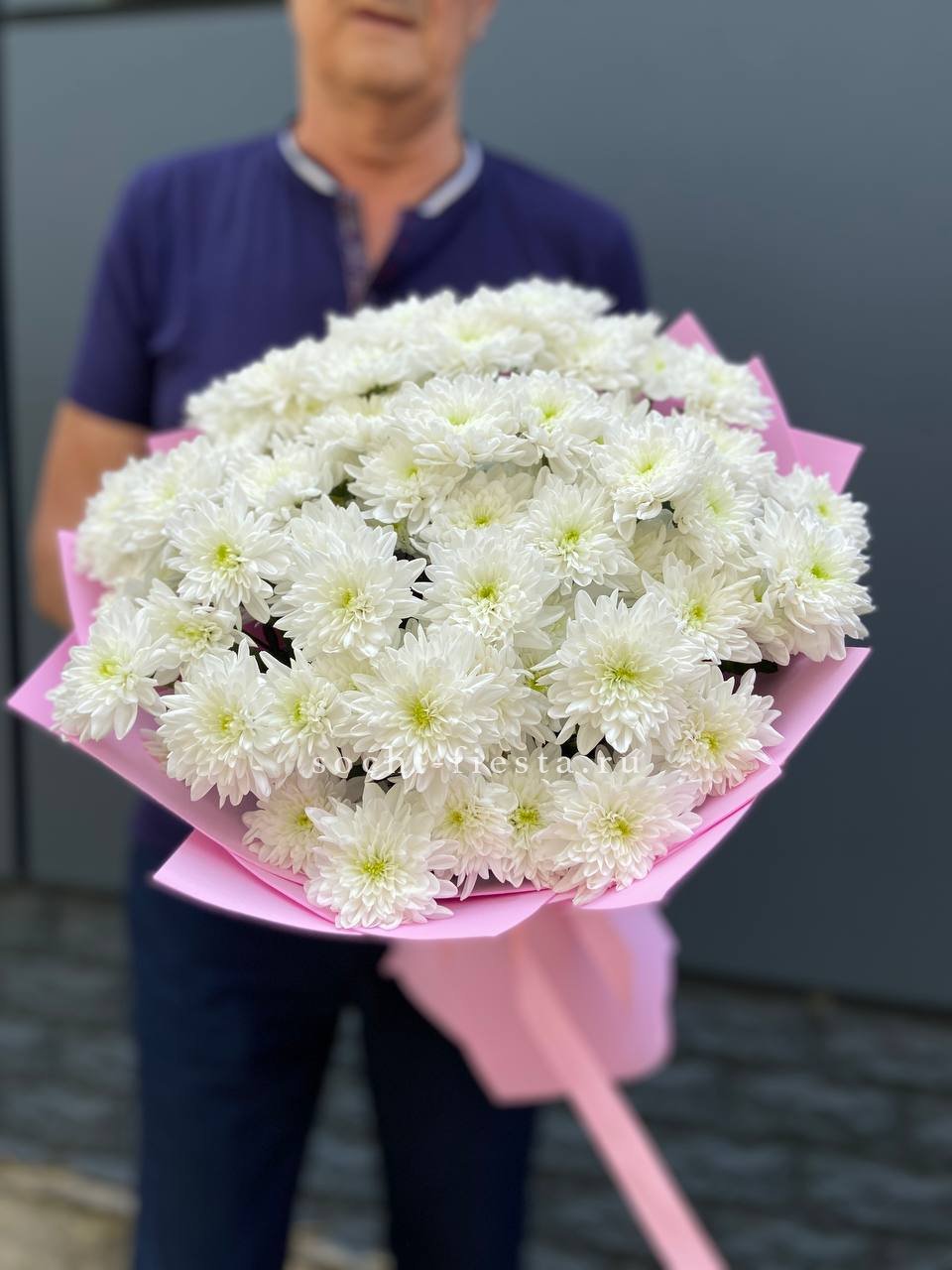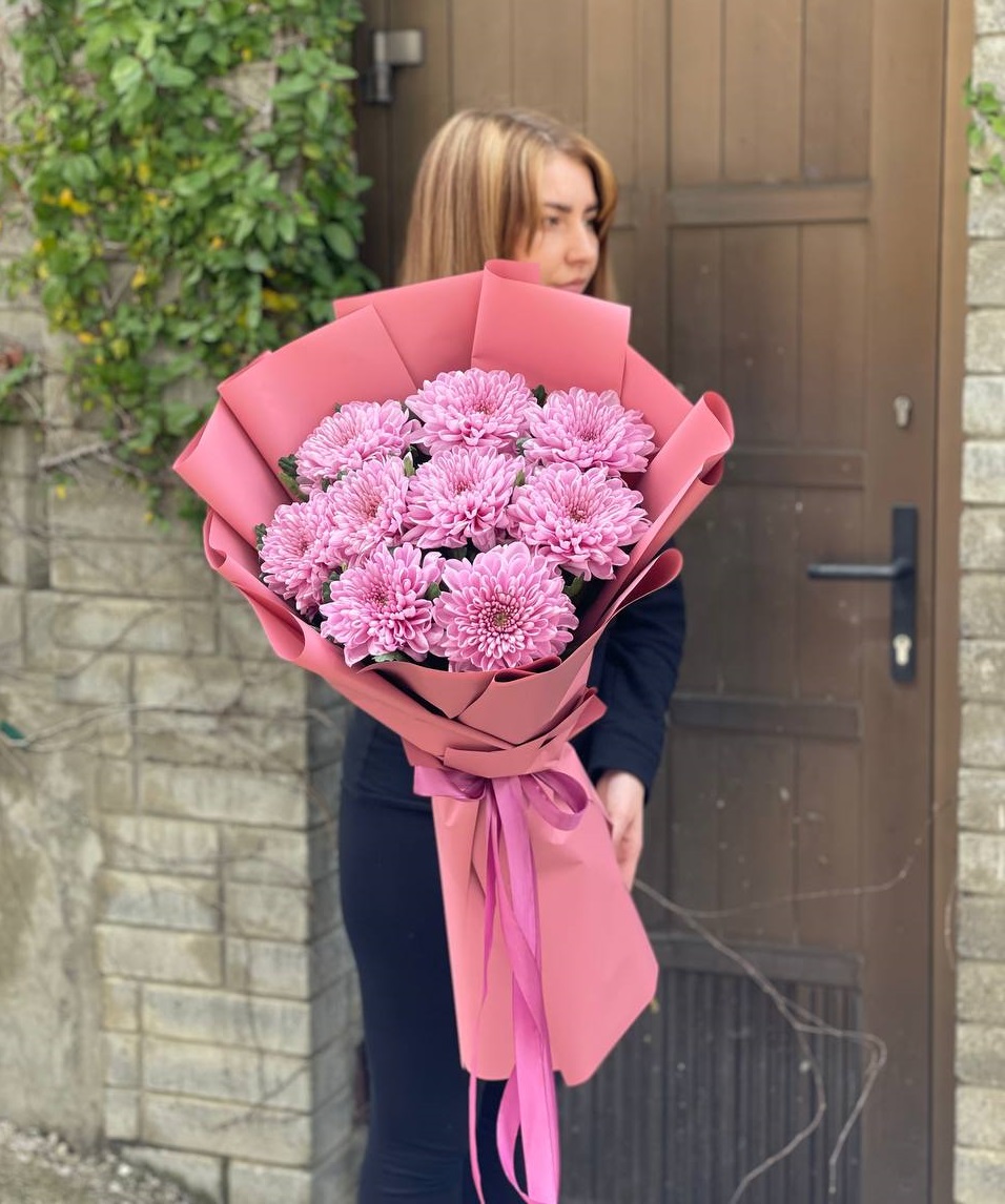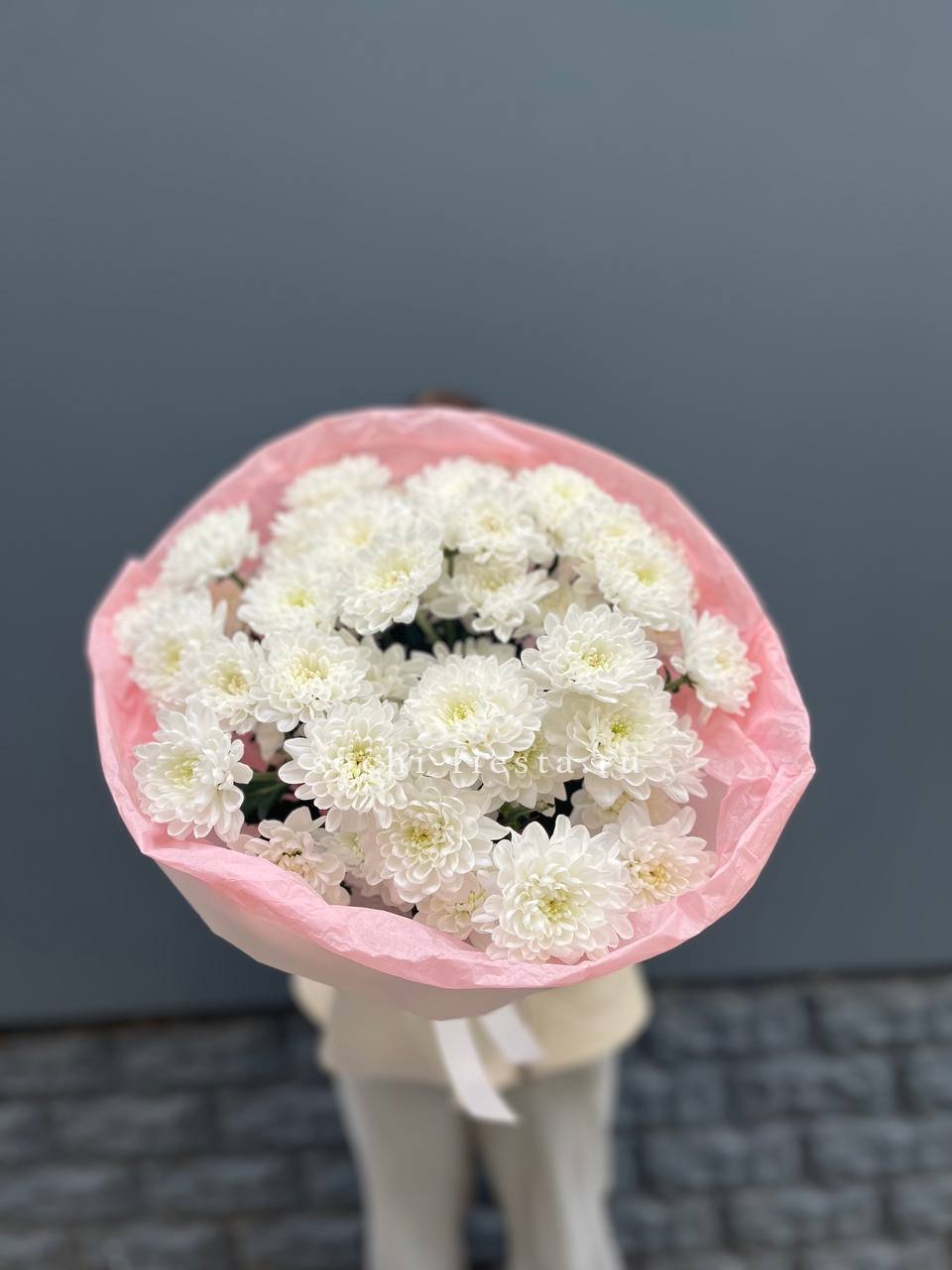 минимальный состав: 7 одноголовых хризантем, лента, упаковка на выбор.
