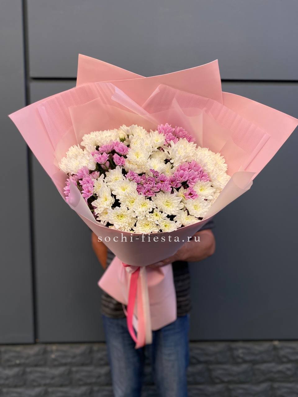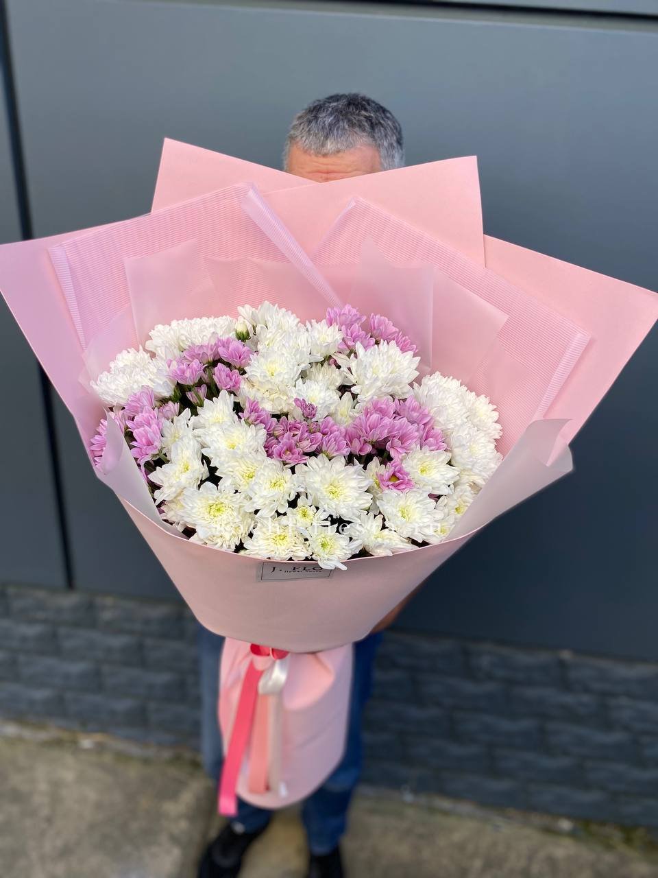 Семь крупных хризантем с открытыми бутонами в дизайнерской упаковке. Букет выглядит свежо и современно, легко вписывается в любое пространство.