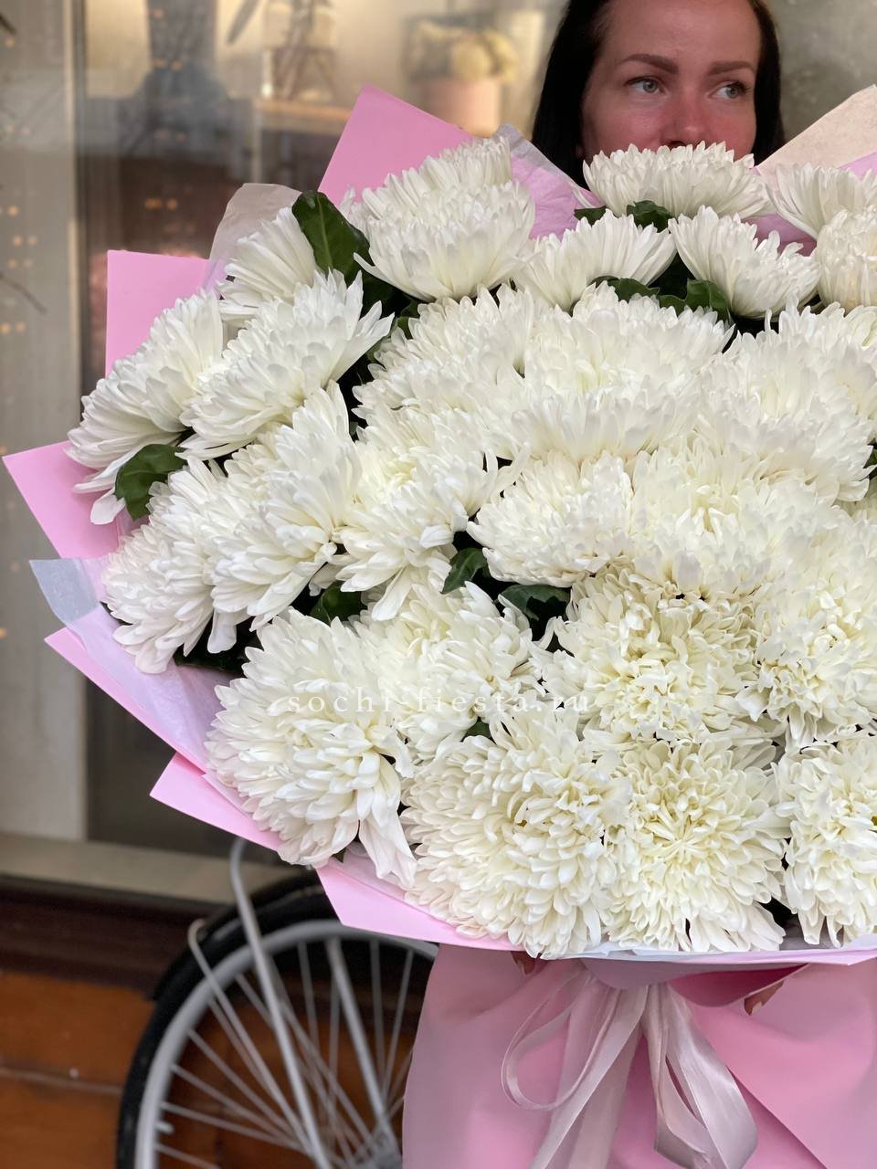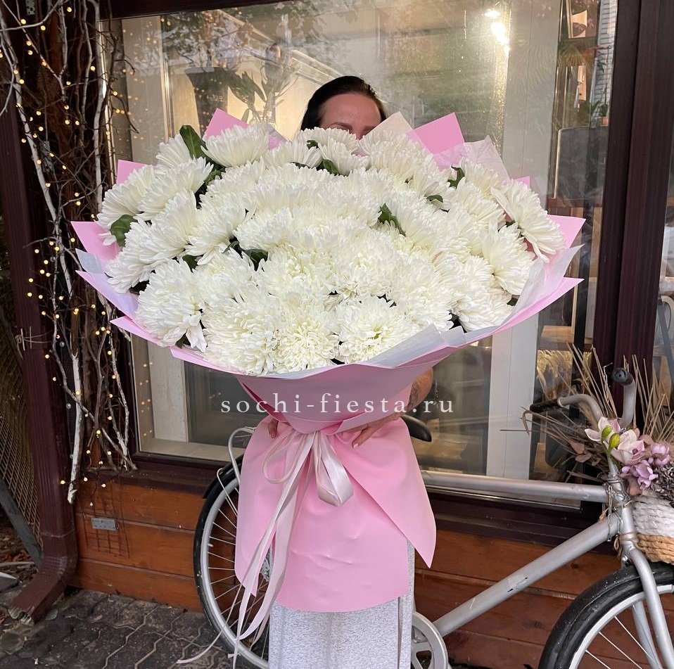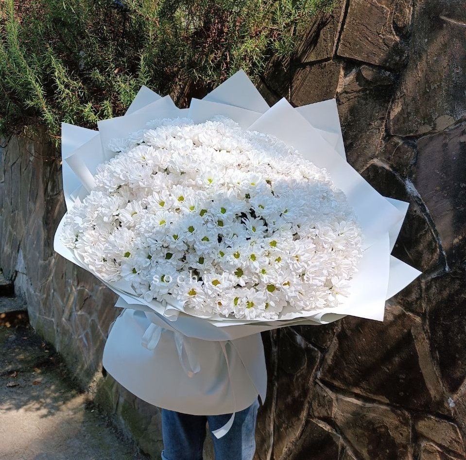 Тридцать девять белоснежных хризантем образуют плотное облако с чёткими графичными линиями. Крупные соцветия создают объёмную структуру, которая держит форму и привлекает внимание своей архитектурой.
