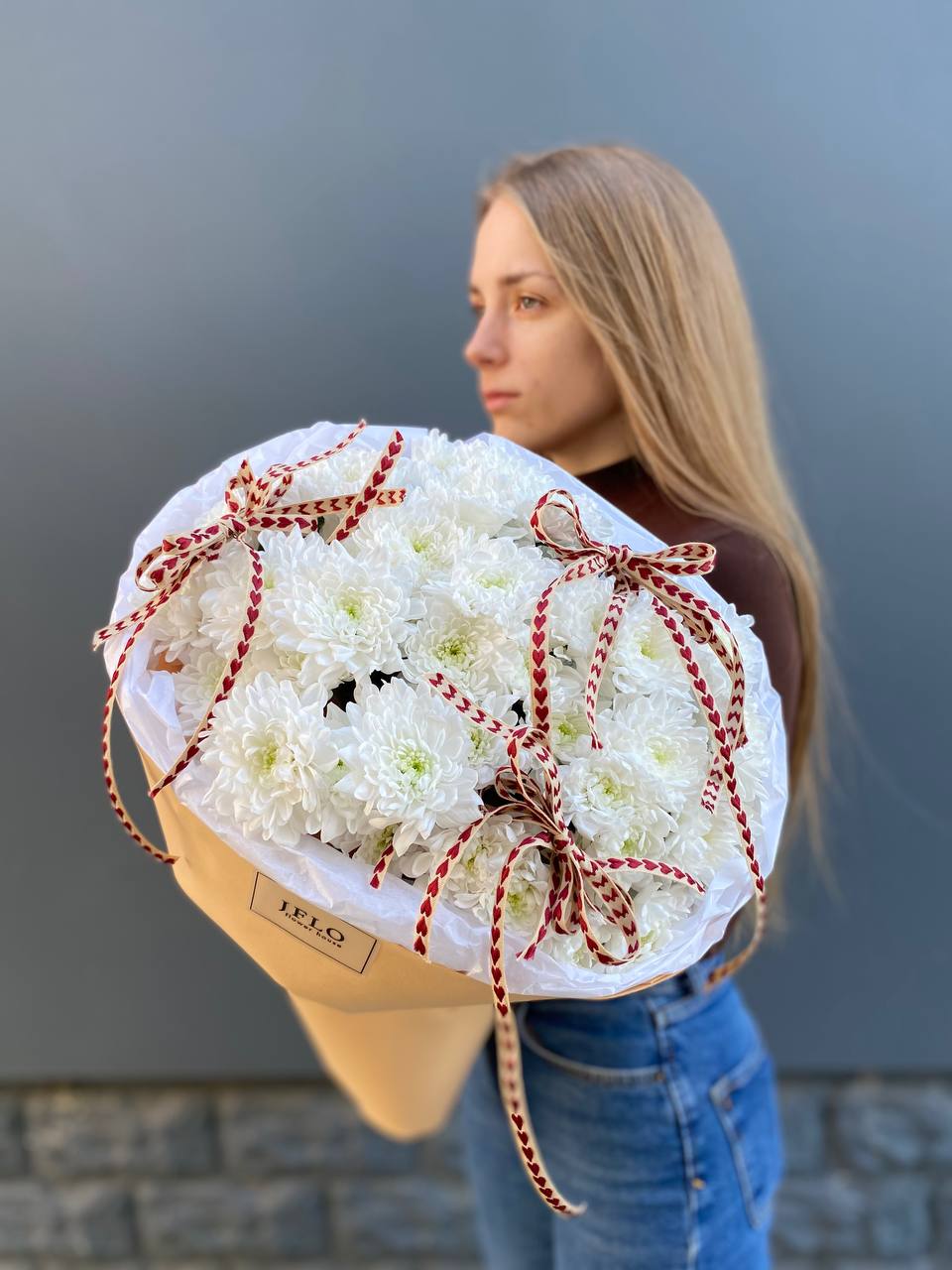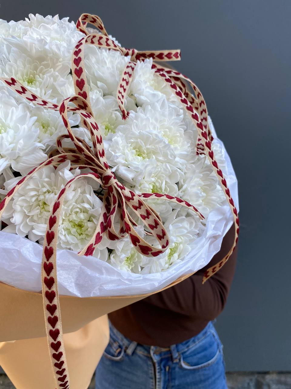 хризантема одноголовая - 39 шт., лента, дизайнерская упаковка.