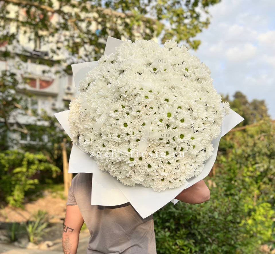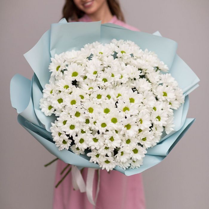 хризантемы - 7 шт, эвкалипт,  лента, дизайнерская упаковка.