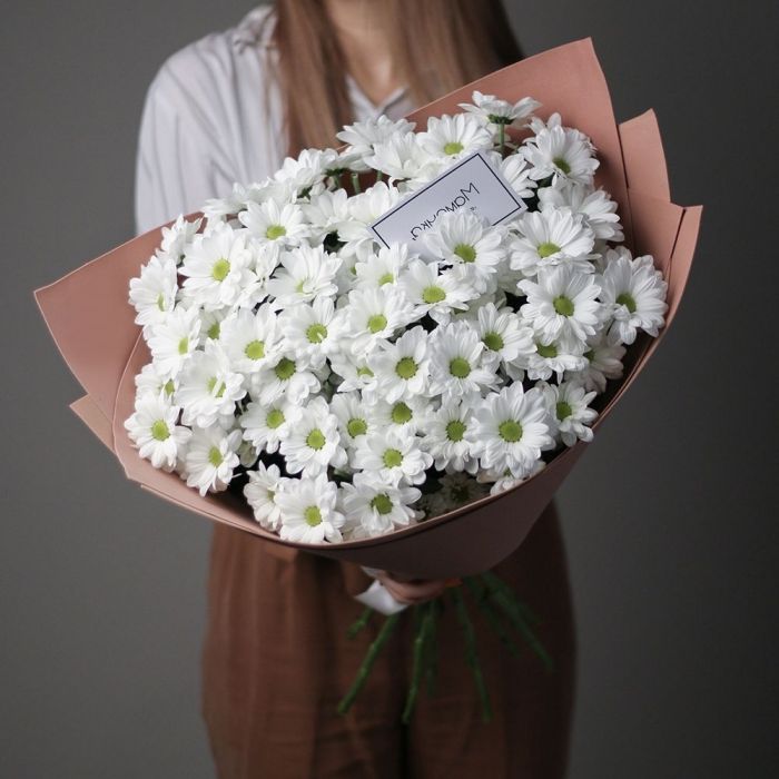 Крупные соцветия одноголовых хризантем раскрываются во всей полноте. Плотные лепестки образуют графичные круги, а сдержанная упаковка сохраняет чистоту формы.