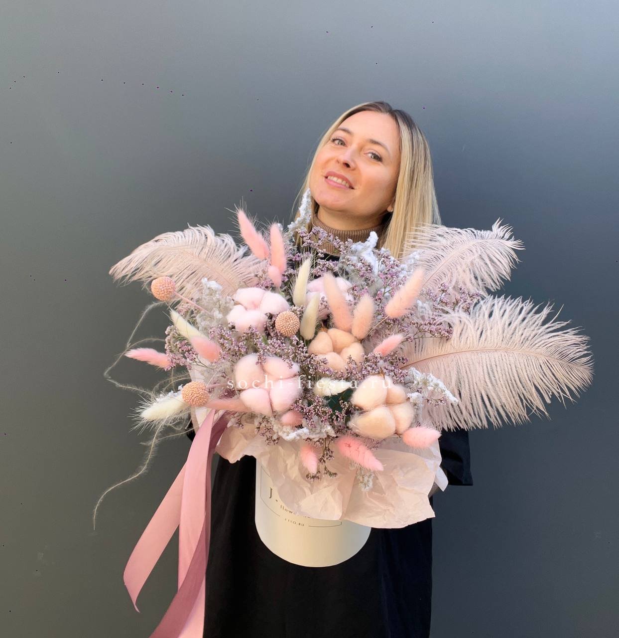Бокс с природными текстурами: мягкость хлопка, воздушность лагуруса и графичность амаранта. Перья добавляют легкости. Композиция держит форму и не теряет выразительности со временем.