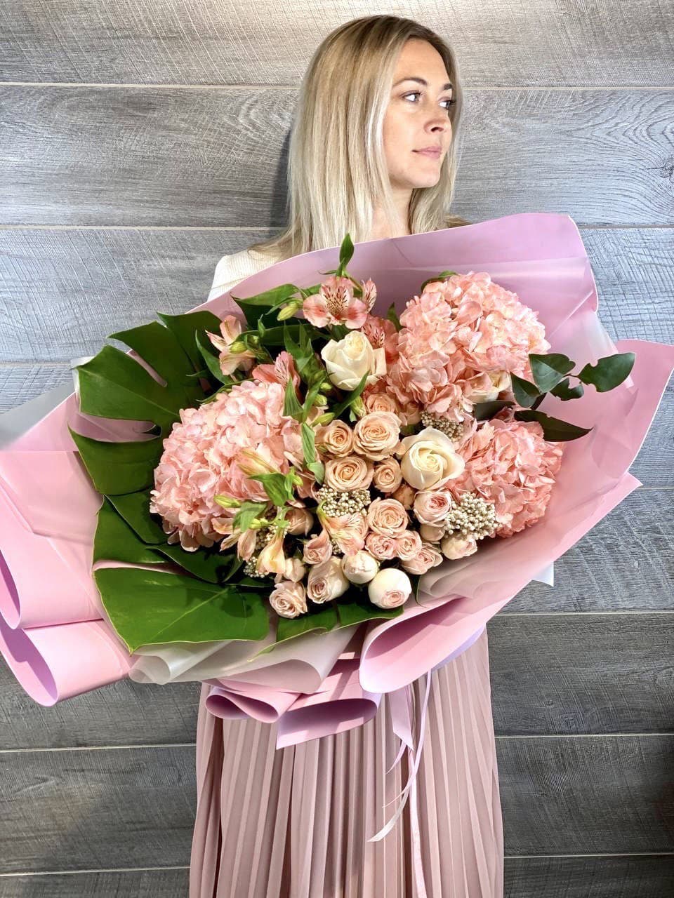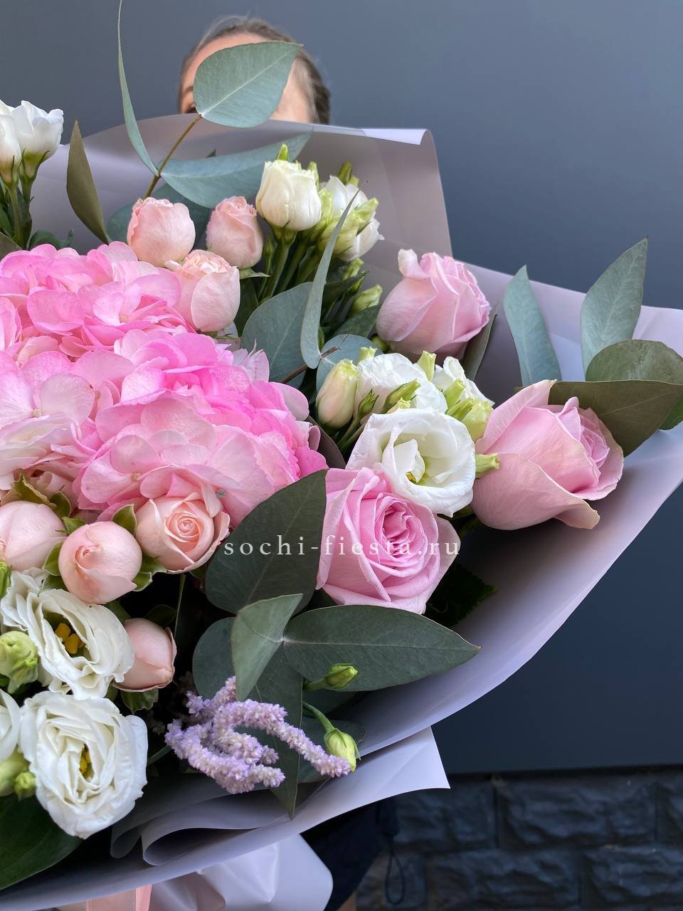 гортензия, диантус, кустовая пионовидная роза, эустома, орхидеи (или аналог), эвкалипт, лента, дизайнерская упаковка.