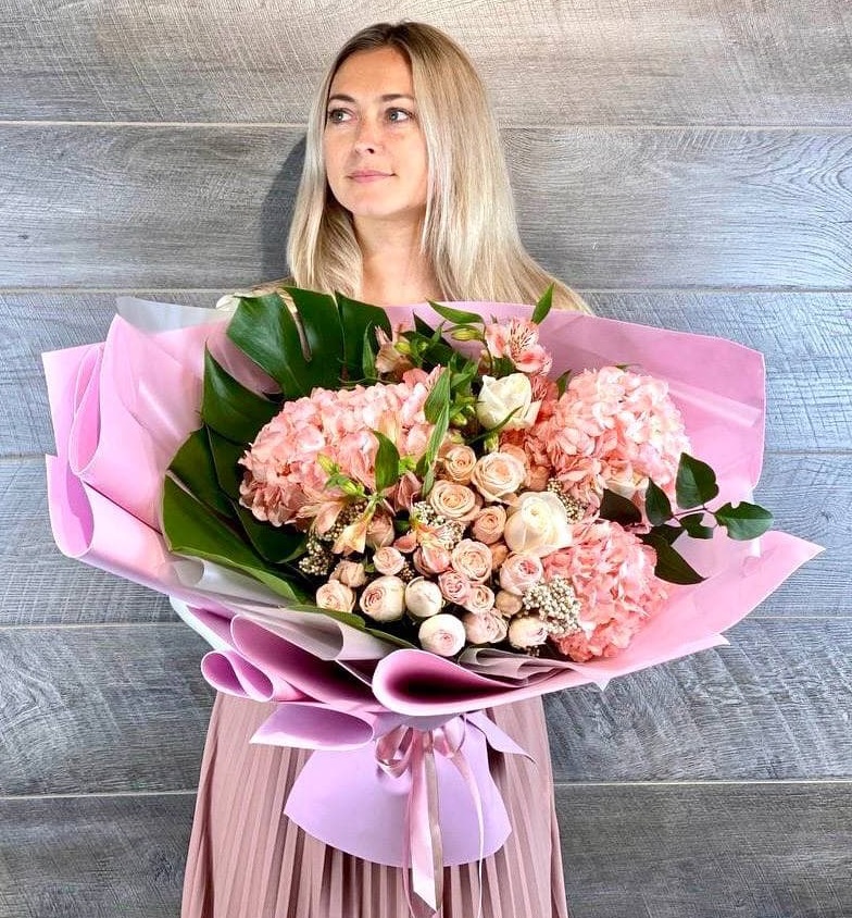 Пышные шапки гортензии переплетаются с бархатными бутонами пионовидных роз, создавая объёмную композицию насыщенного розового оттенка. Орхидеи и эустома добавляют воздушности, а диантус расставляет яркие точки. Букет заполняет пространство и притягивает взгляд своей плотной структурой.