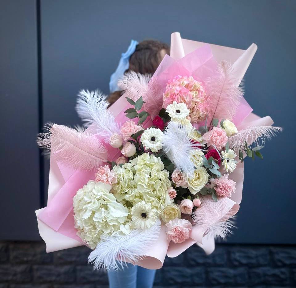Пышный микс соцветий гортензии, роз и гербер с добавлением перьев и озотамнуса. Авторская композиция объединяет садовую свободу и графичную точность линий.