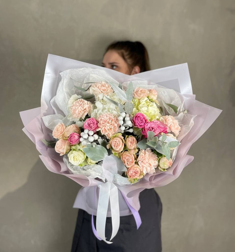 Пышные шапки гортензии и кустовые розы образуют плотную композицию с выраженным объёмом. Серебристая бруния и эвкалипт добавляют графичности, а диантусы разбивают крупные формы лёгкими вкраплениями. Авторская сборка с продуманной структурой и естественной пластикой.