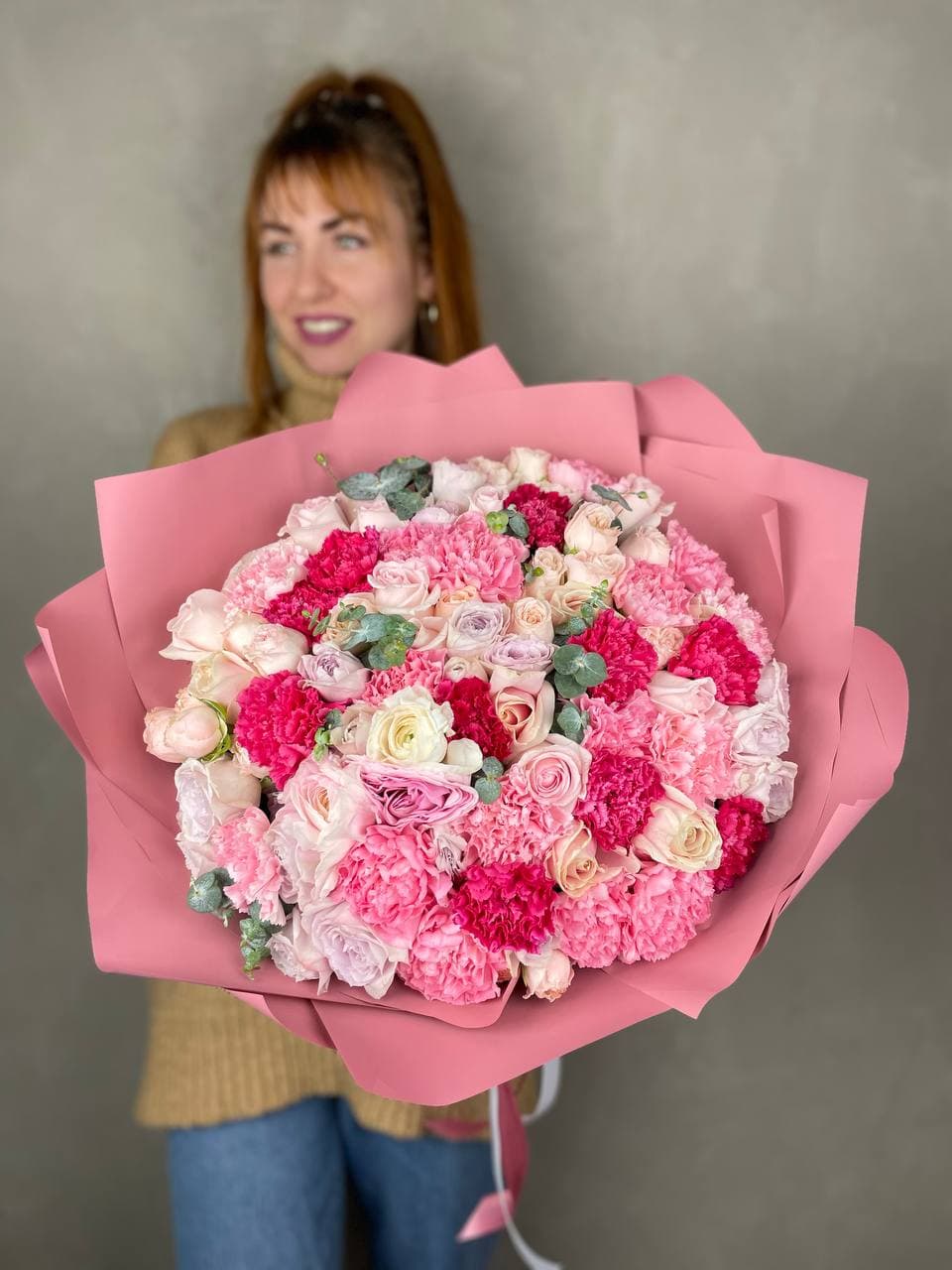 Пионовидные бутоны с волнистыми лепестками соседствуют с графичными диантусами и свежими ветками эвкалипта. Авторская упаковка завершает образ, добавляя композиции современное звучание.