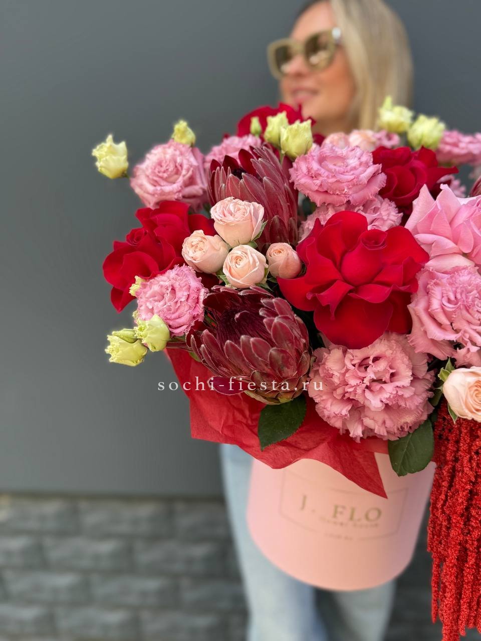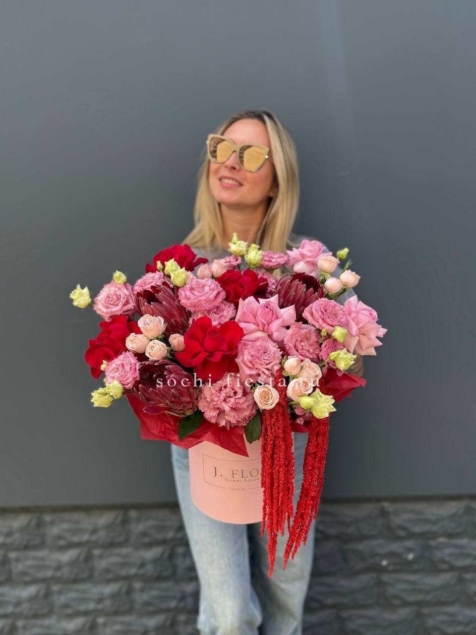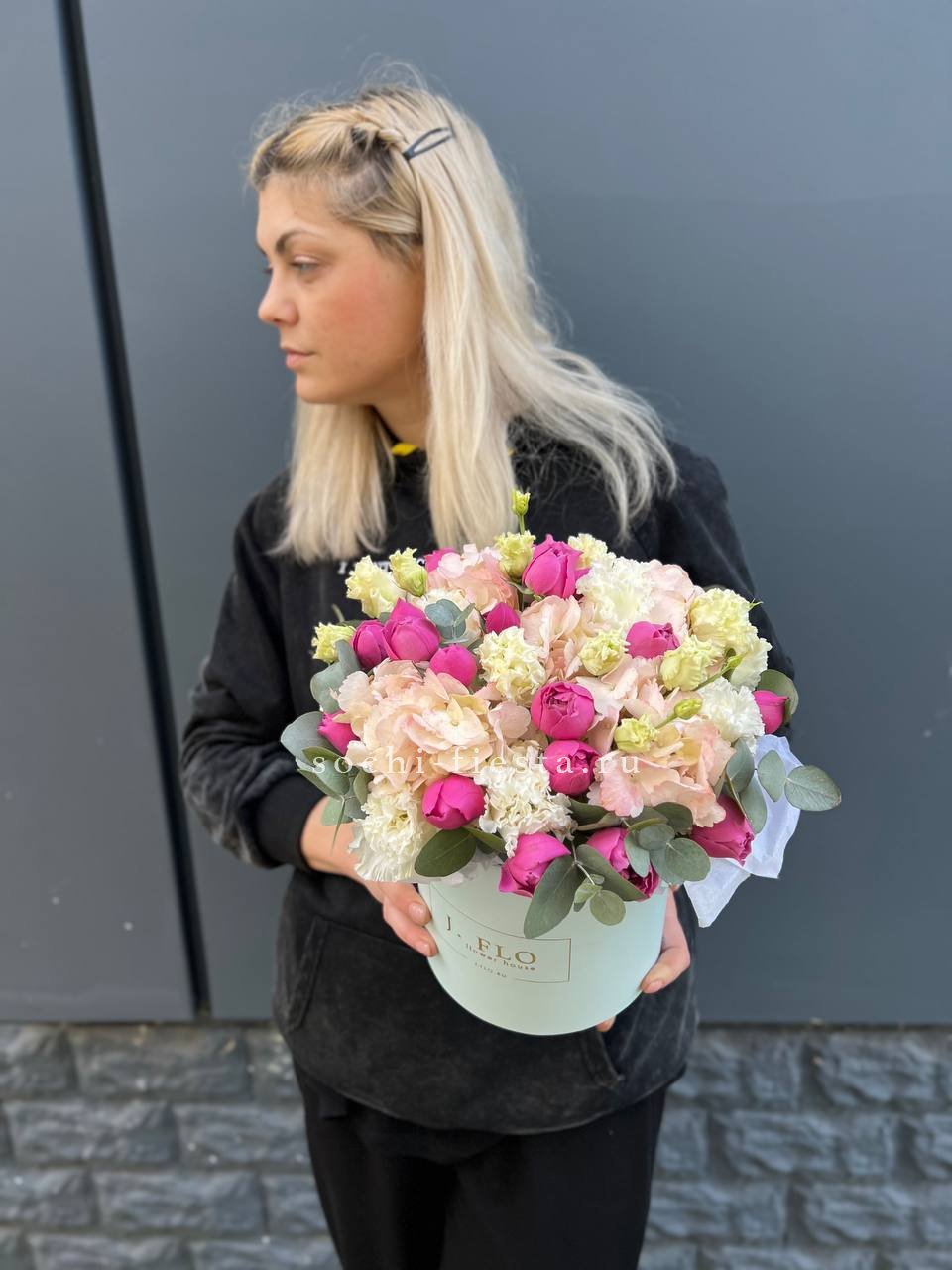 Сочетание вывернутых роз с гортензией, диантусами, розами, бомбастиками создает воздушных элегантный образ идеального цветочного подарка