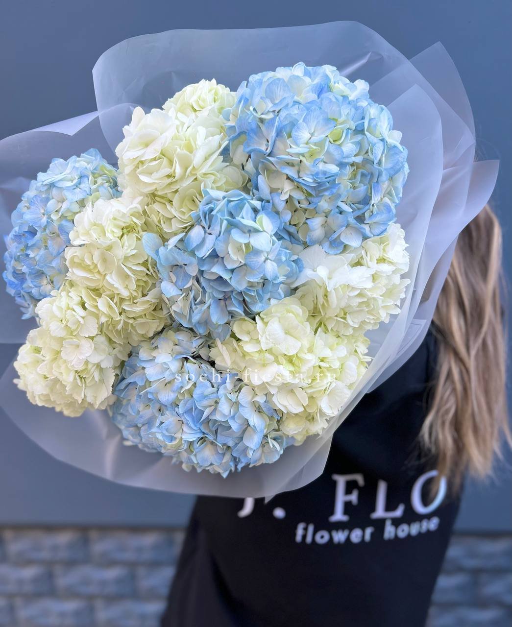 Гортензия и кустовые розы соединяются с веточками эвкалипта и ваксфлауэра в свободной композиции. Разная плотность соцветий создаёт живой ритм и природную лёгкость.