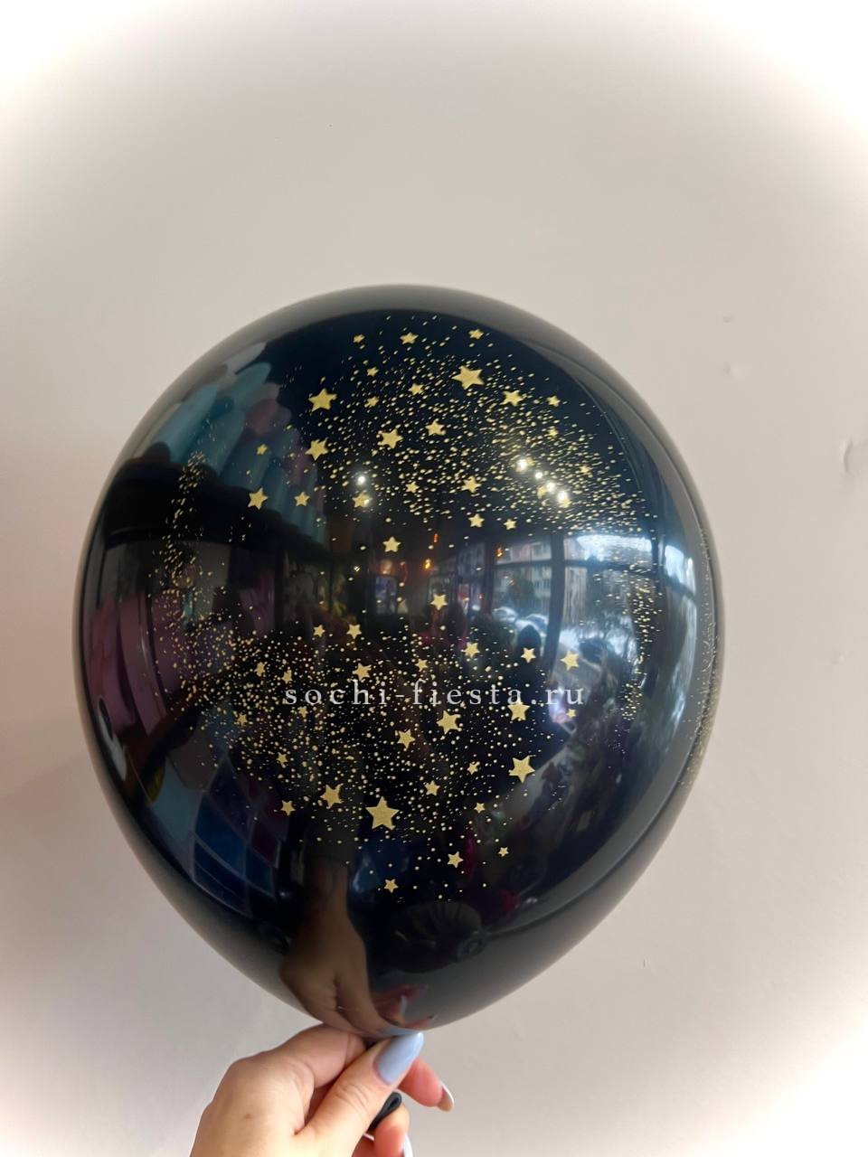Три варианта оформления в одной серии: черный матовый, прозрачный с конфетти и акцент в виде золотой короны. Латексная основа держит форму несколько дней и легко вписывается в любую композицию.