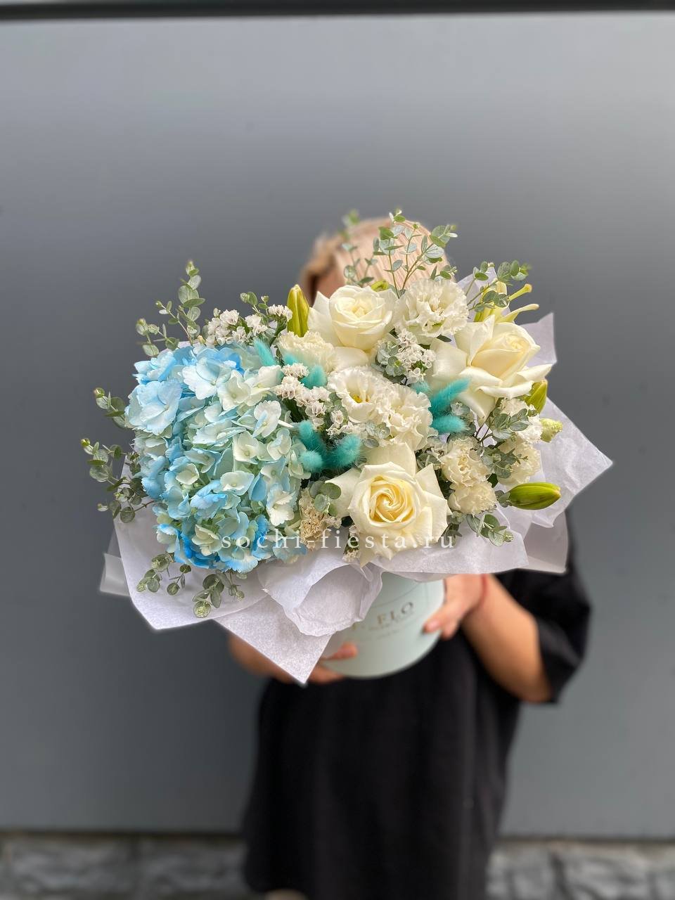 Голубая гортензия задает спокойный тон всей композиции, где статица и лагурус добавляют воздушности. Розы и лилии дополняют образ свежими акцентами без лишней пышности.