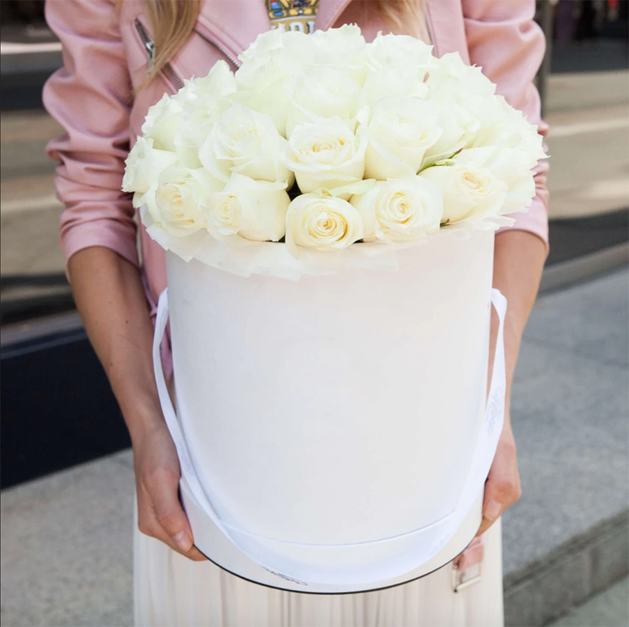 бокс 20D, белая французская роза, эустома, эвкалипт.