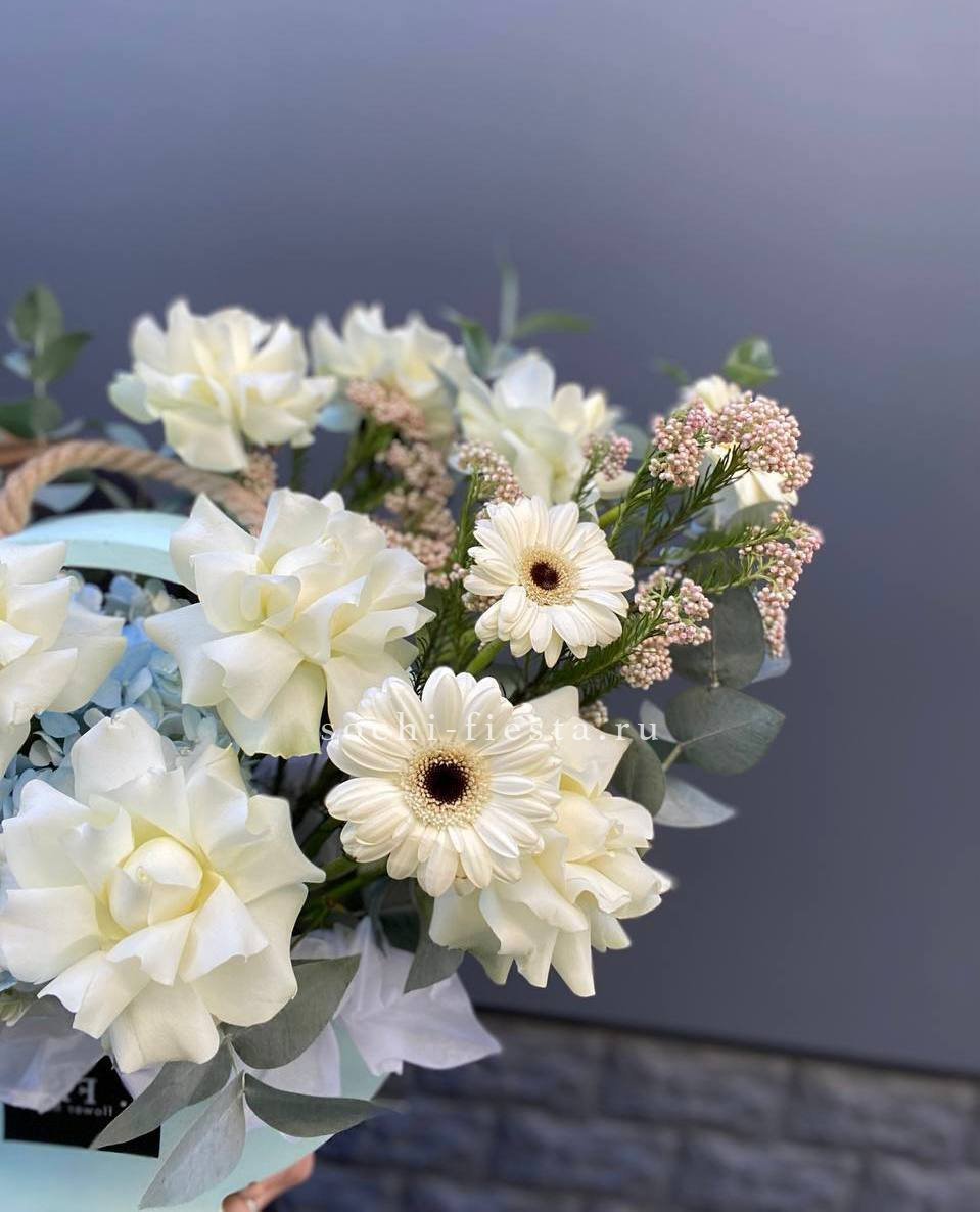 Белые розы и герберы выстраивают светлую основу, а синий дельфиниум задаёт вертикальный ритм всей композиции. Гортензия и озотамнус заполняют пространство между крупными бутонами.