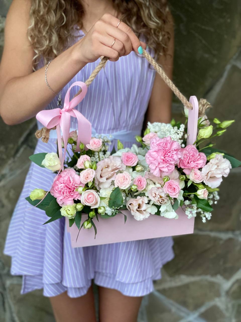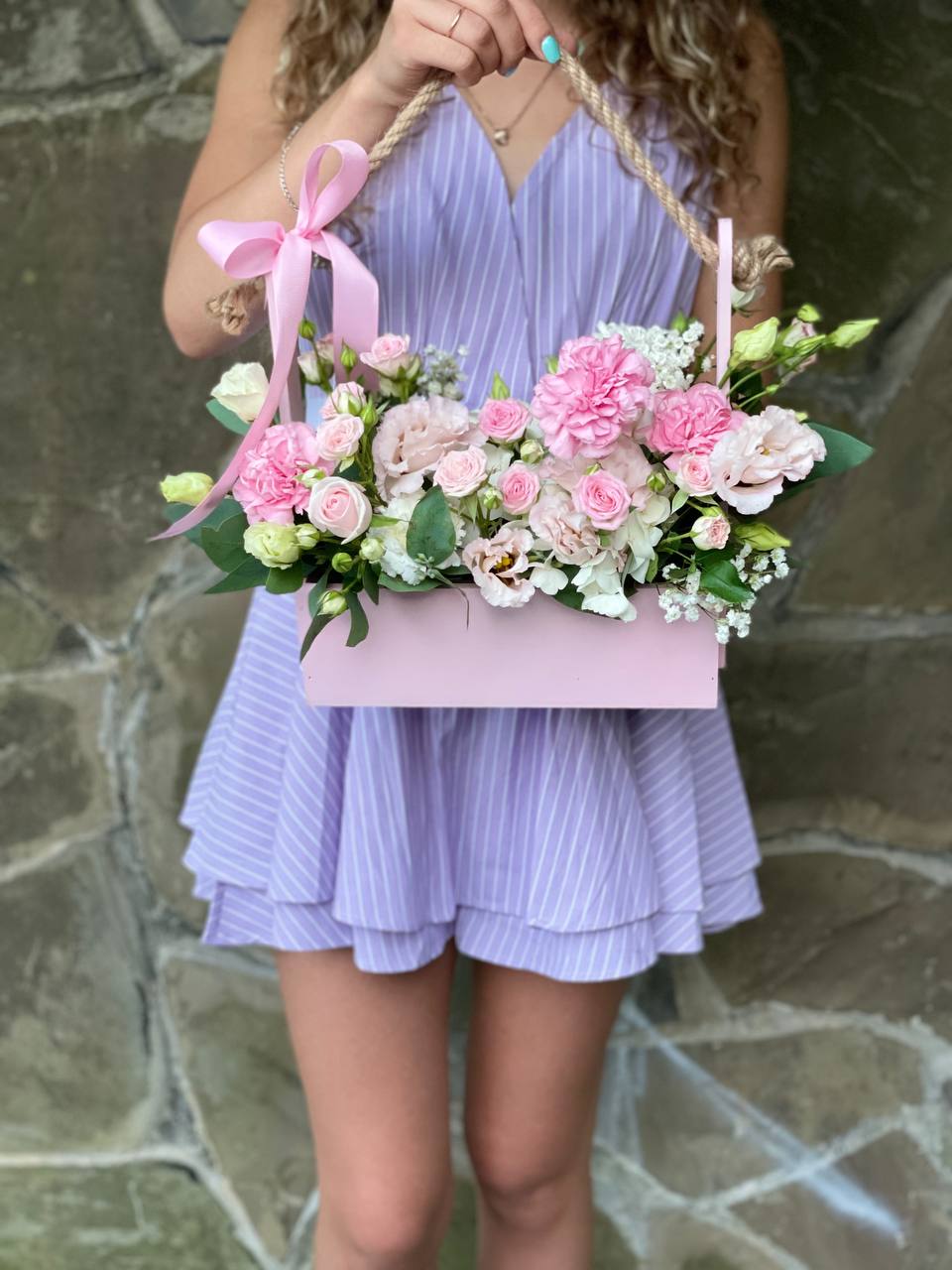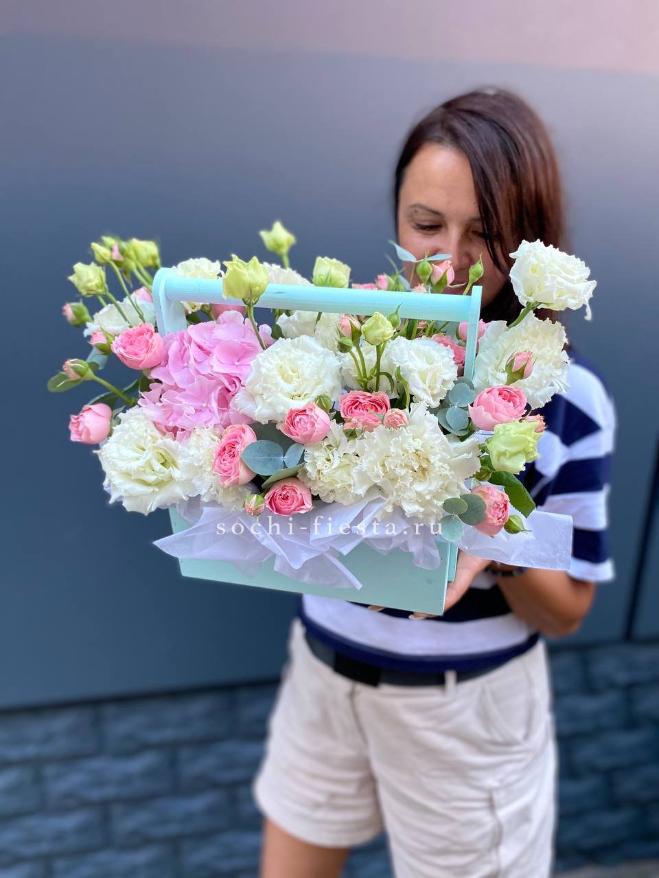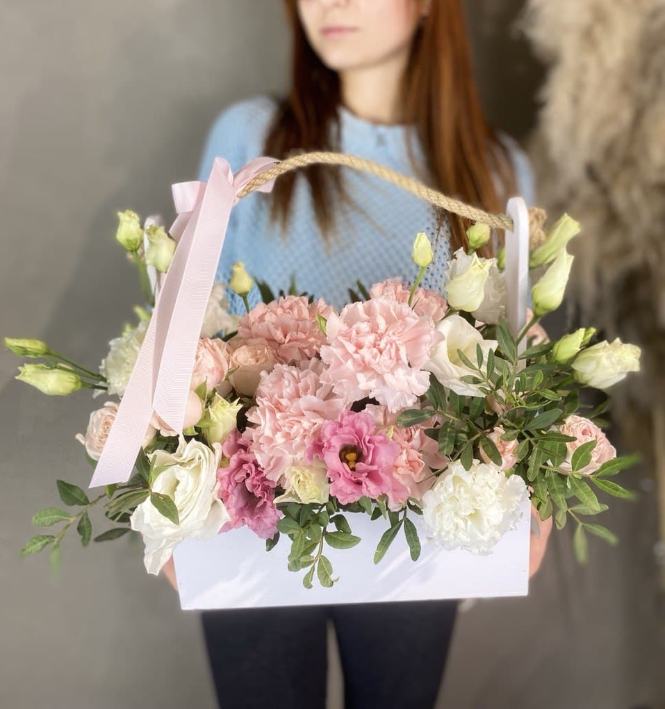 гортензия, диантус, кустовая роза, эустома, эвкалипт, гипсофила/бруния/хамелациум, деревянный ящик, пиафлор, лента Состав композиции может быть незначительно изменен флористом в процессе изготовления с соблюдением стилистики, фактуры и цветовой гаммы оригинала.
