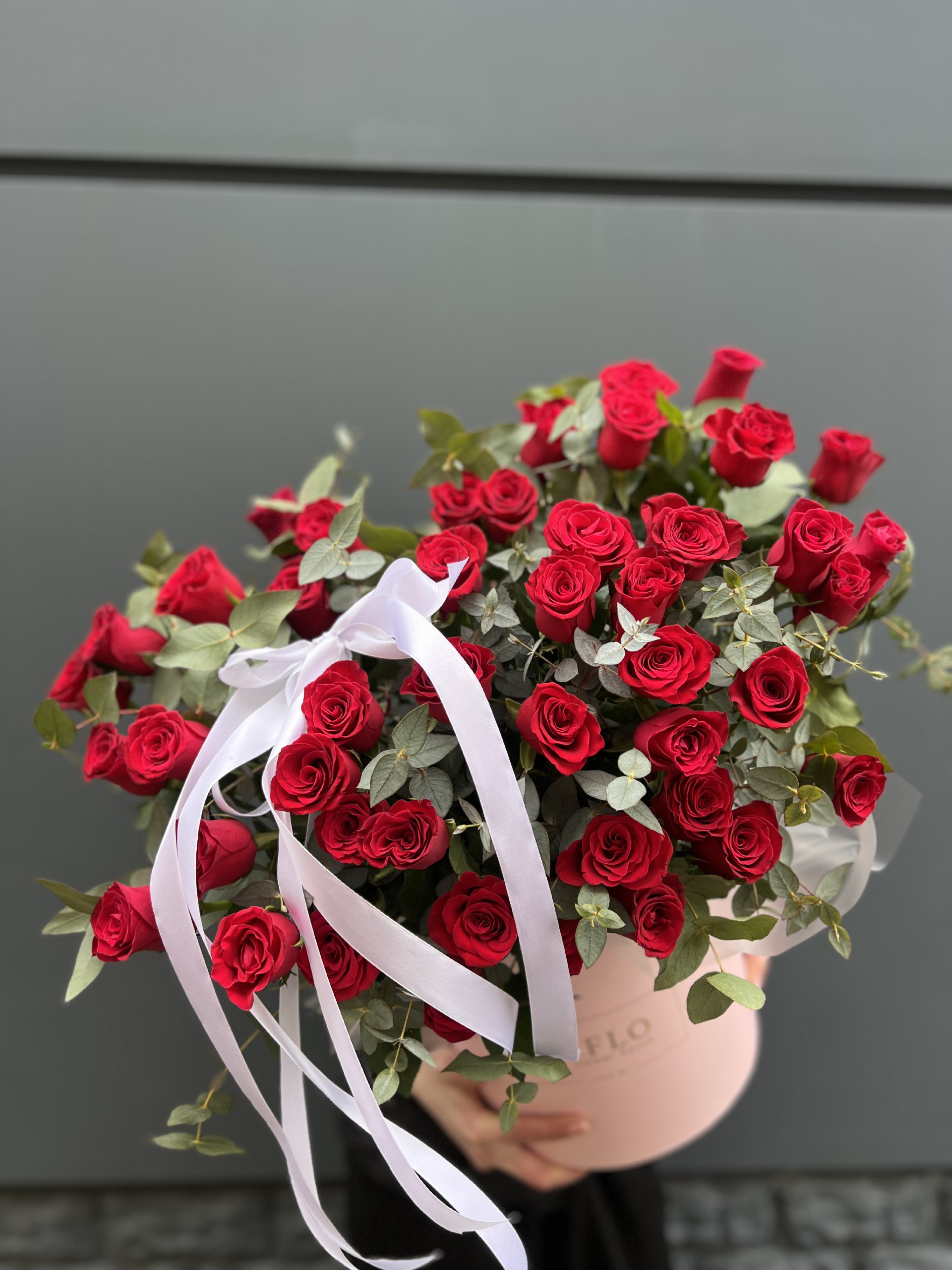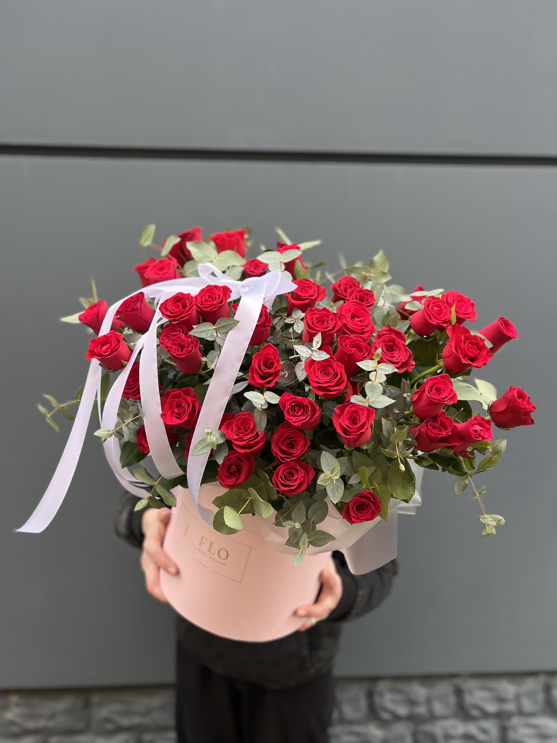 французские розы, эвкалипт, кашпо.