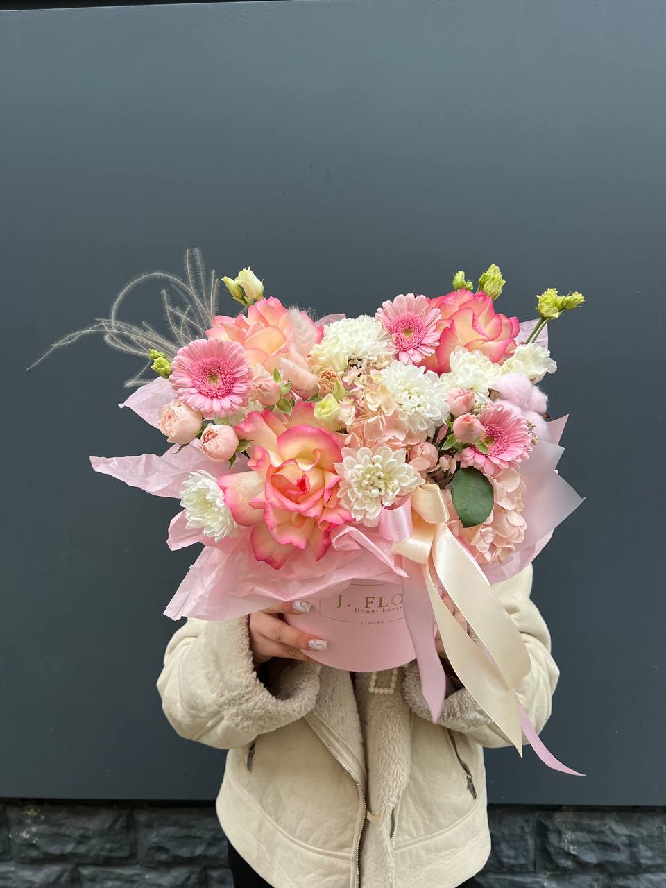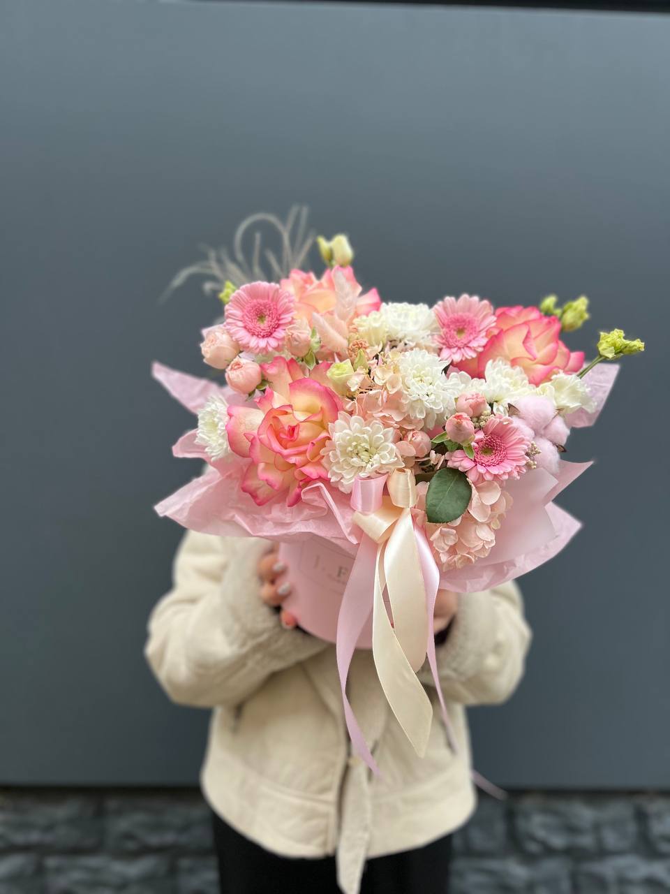Композиция в коробке объединяет пышную гортензию, воздушную эустому и кустовые розы, Джумилию с яркими гербами и хлопком. Плотное заполнение создает округлую форму, где каждый цветок находит свое место без пустот.