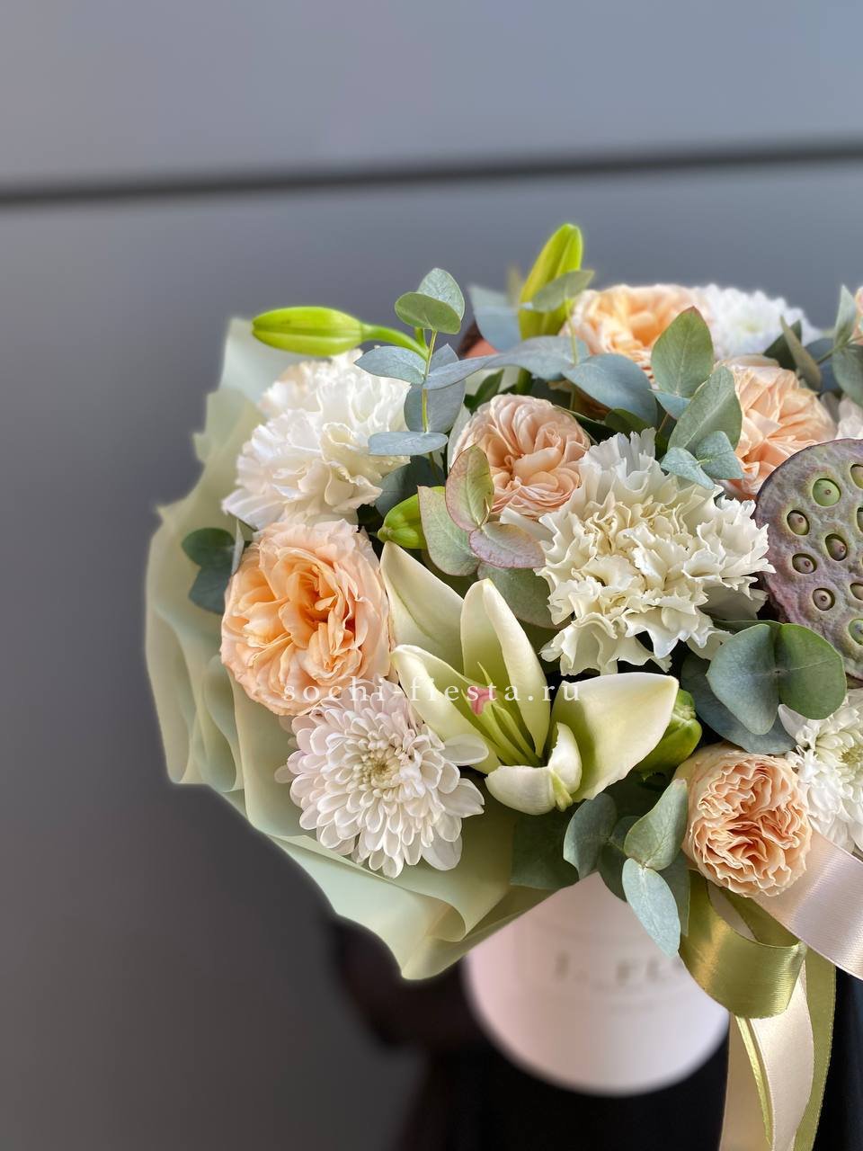 кустовая роза, лилия, диантус, лотос, эвкалипт, бокс 13.