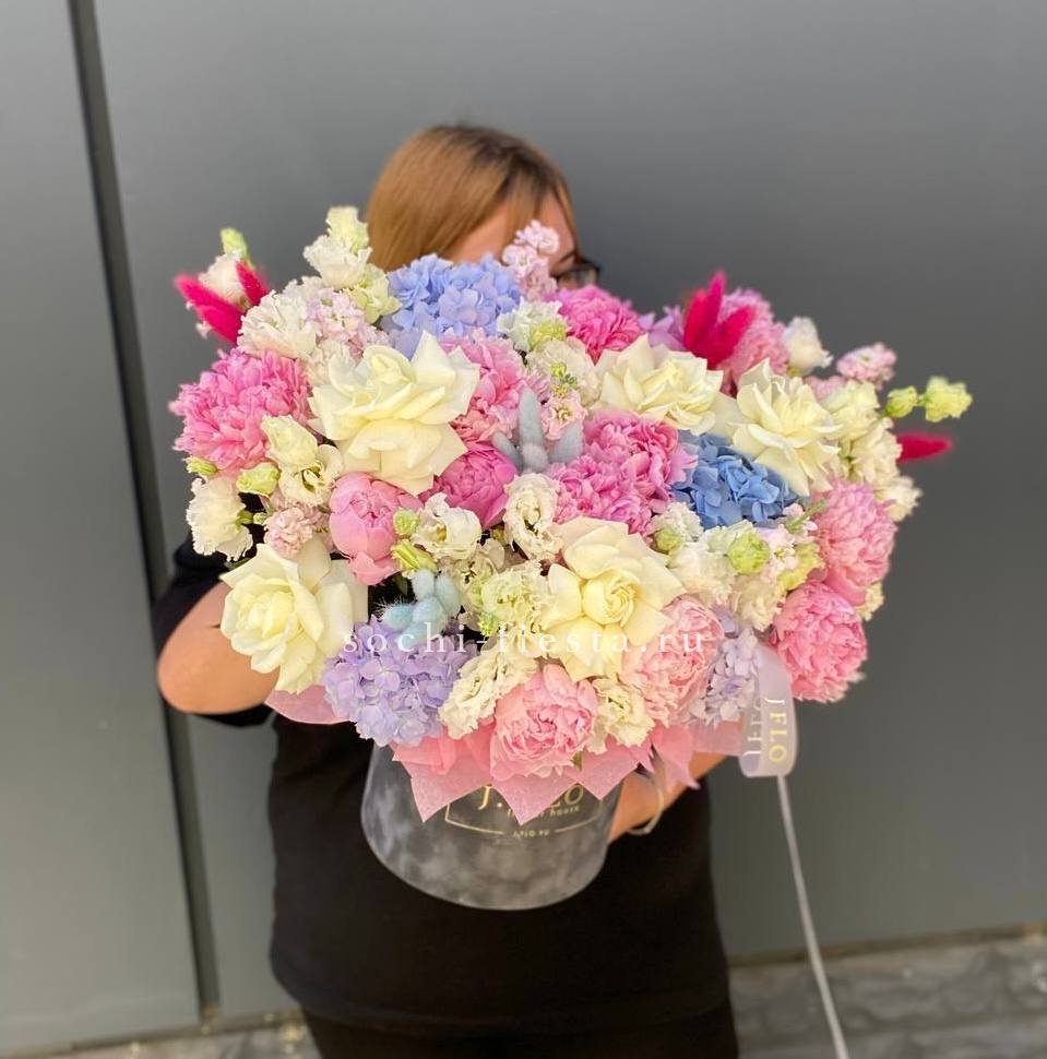 пионы, маттиола, эустома, белые розы, лента, гортензия, цилиндр D20.