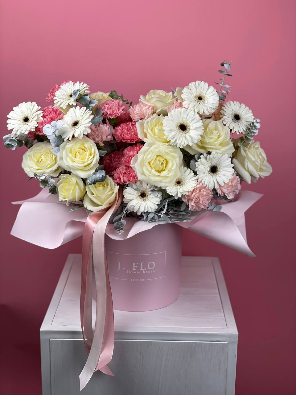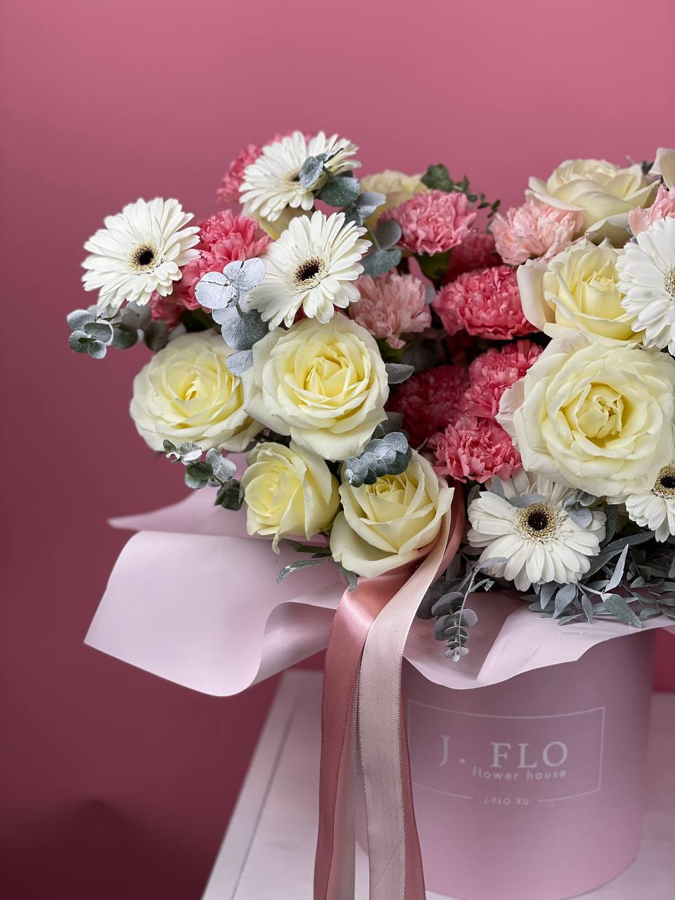 цветочная композиция в бело-розовых тонах в нежном розовом цилиндре D25.