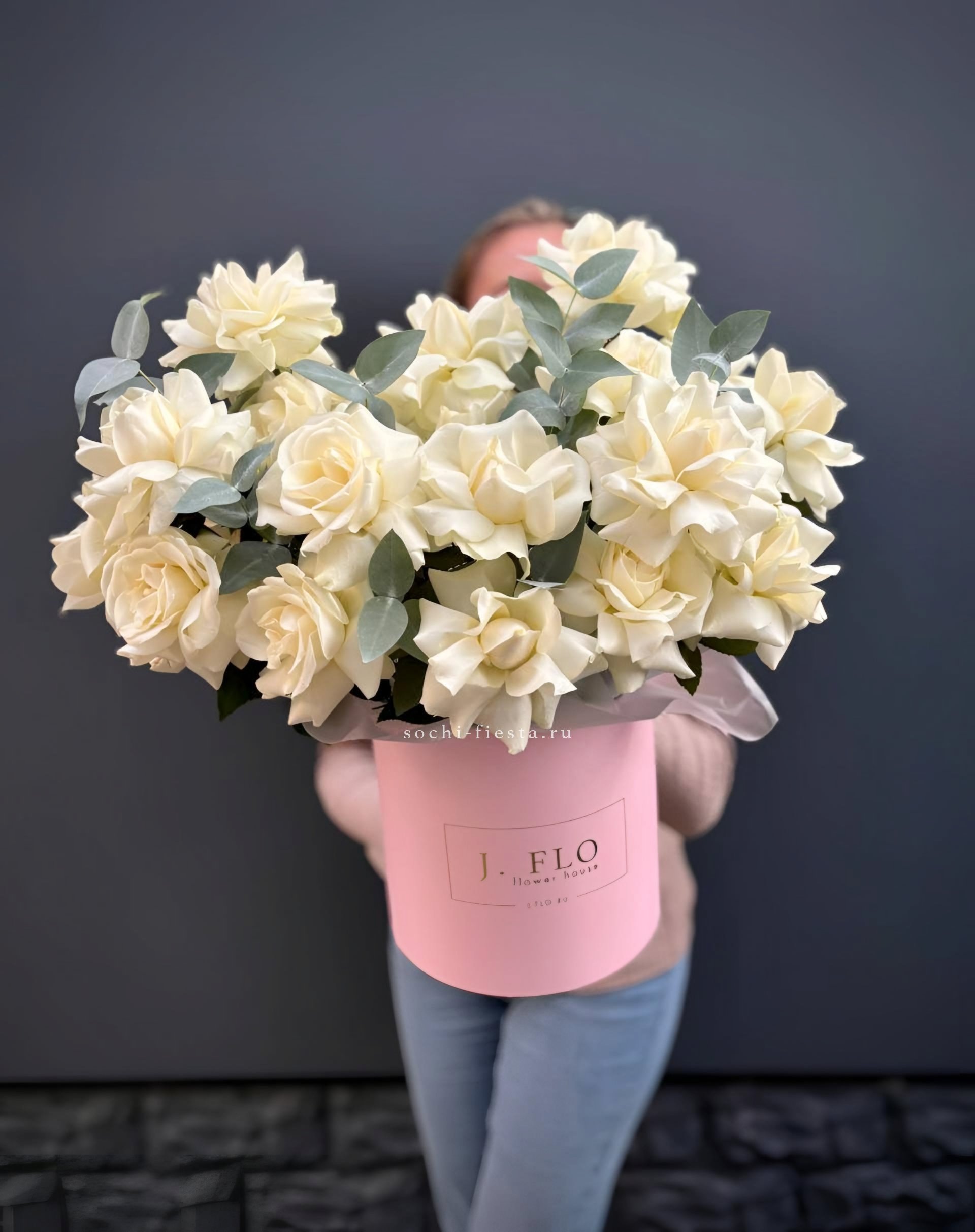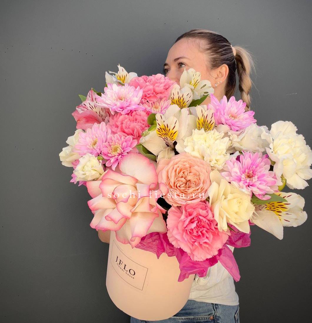 Воздушная композиция в бело-розовой гамме раскрывается мягкими переходами оттенков. Цилиндр нежного розового цвета завершает образ и создает единое цветовое впечатление.