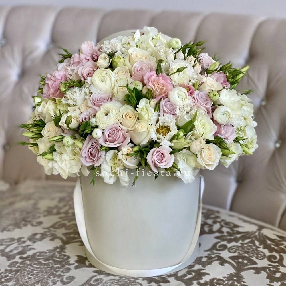 цветочная композиция в нежно-розовых тонах в светлом цилиндре D25.