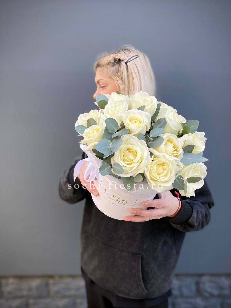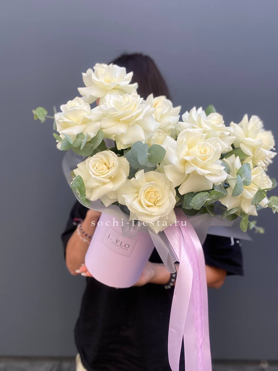 Пышные головки диантуса собраны плотной шапкой в круглой коробке. Ветви эвкалипта создают воздушное обрамление. Минималистичная композиция с выраженной текстурой.