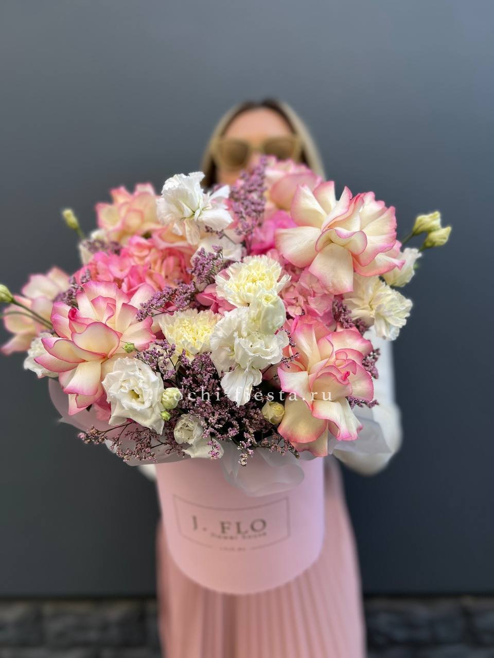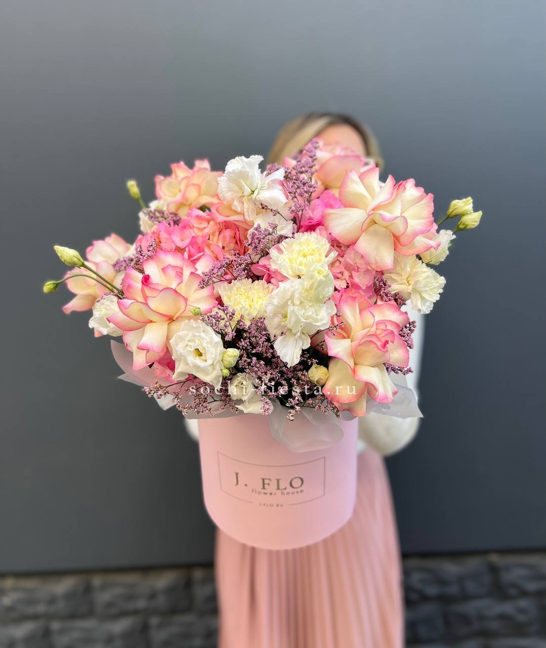 гортензия, одноголовые розы, пионовидные розы, диантусы, лента, цилиндр D20.