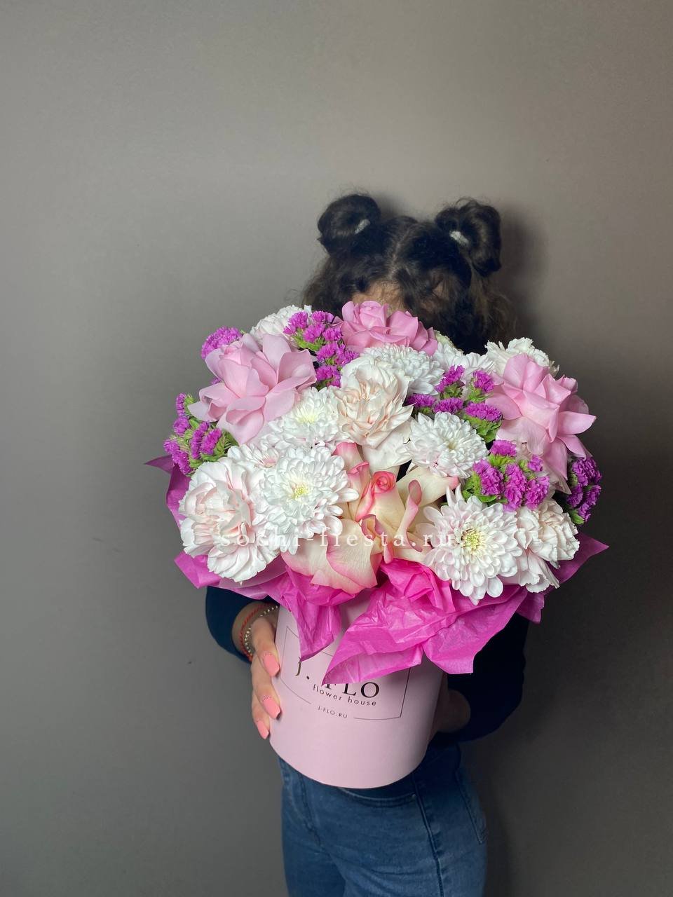 Гортензия обволакивает центр композиции, где розы и диантусы собраны плотной группой. Цилиндр держит форму вертикально, а лента завершает силуэт лаконичной линией.