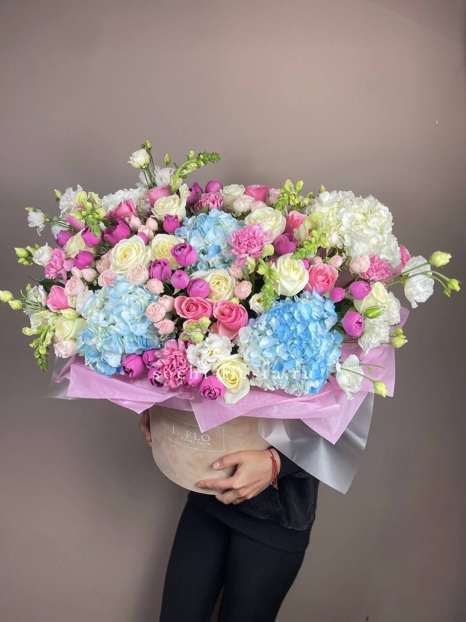 Масштабная композиция в цилиндре собирает пионовидные розы, гортензию и георгины в плотную объемную форму. Высота и диаметр создают выразительное присутствие в интерьере.