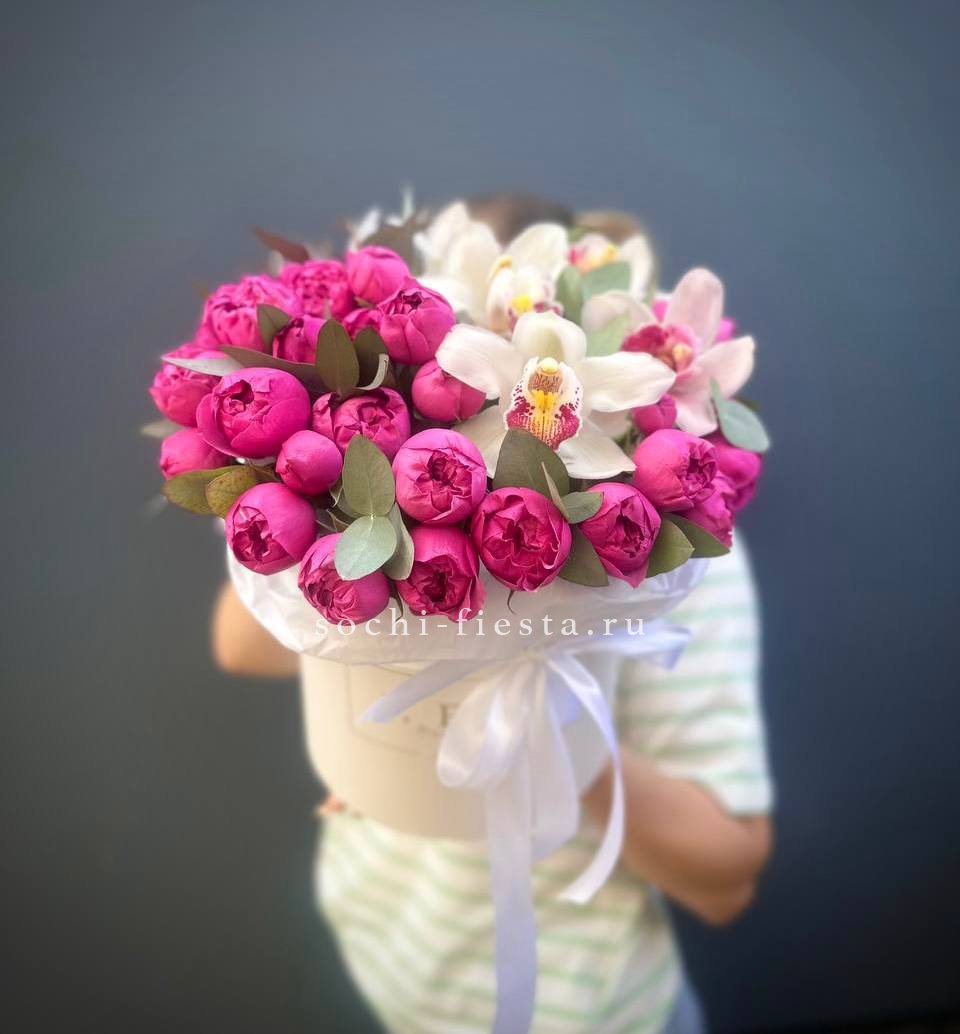 Пионовидные розы Мисти Баблс и экзотичные орхидеи Цимбидиум создают композицию с мягкими переходами оттенков. Цилиндрическая форма собирает цветы в плотную структуру с выразительным силуэтом.