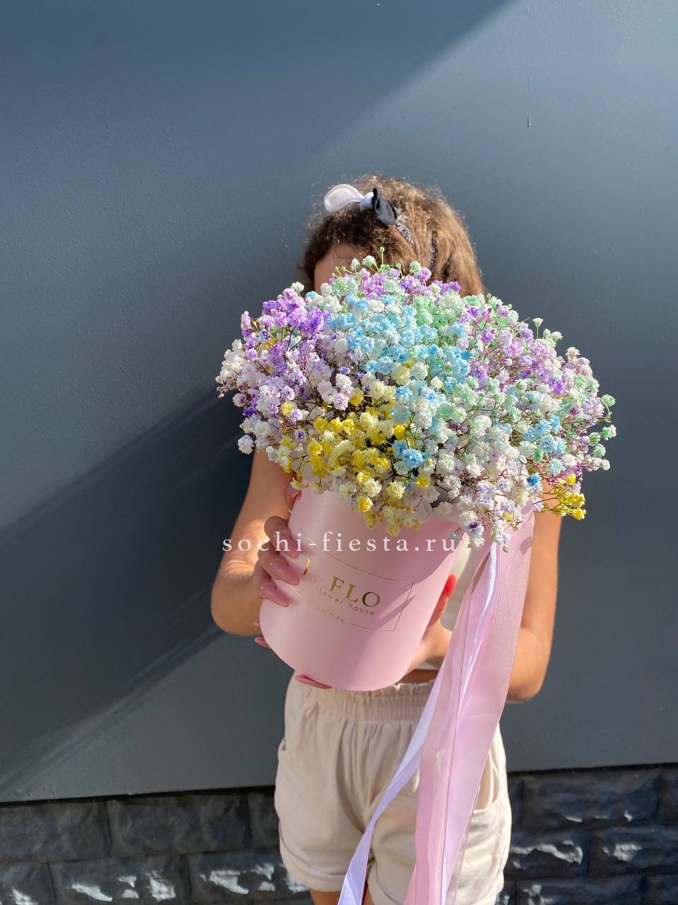Радужные гипсофилы в шляпной коробке